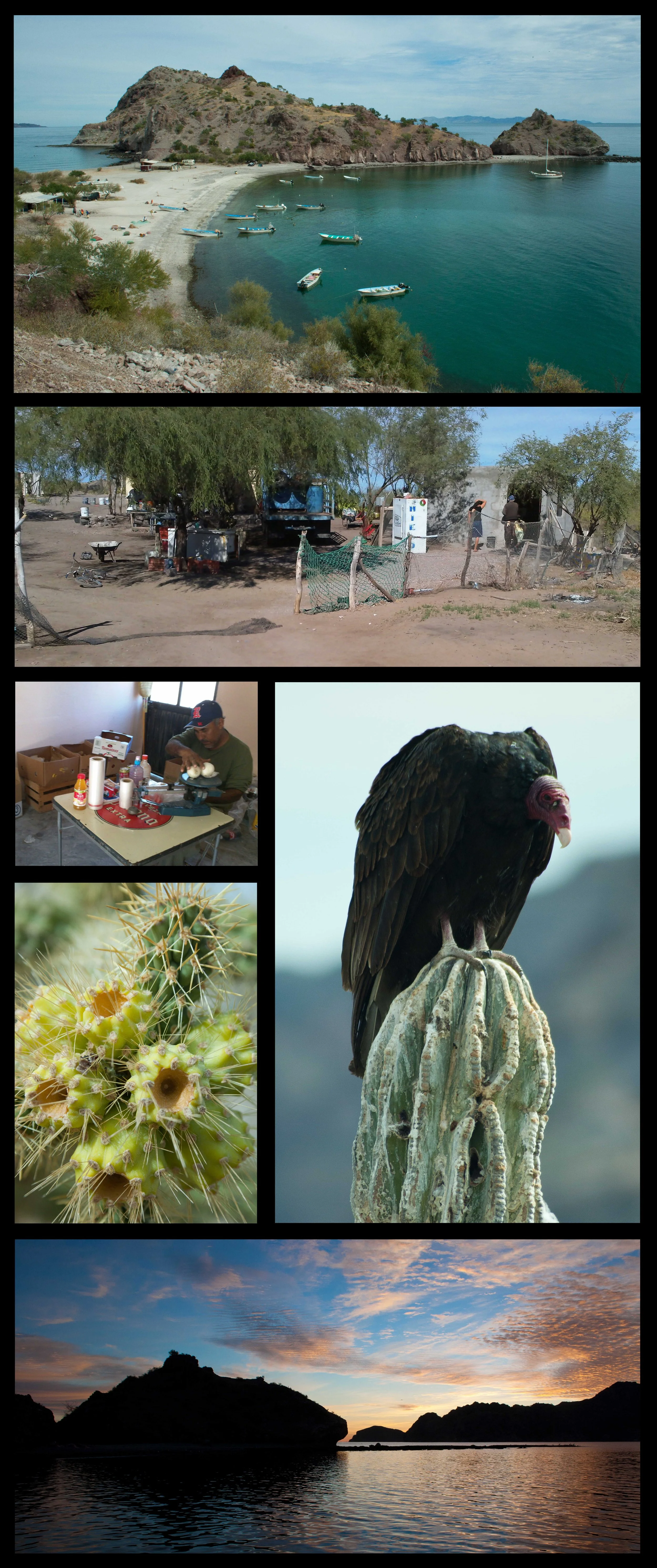 We sailed south from Punta Colorada back to Bahia Agua Verde, which was our first downwind sail since leaving La Paz. We arrived in Agua Verde in the late afternoon and decided we would spend a couple of days here this time to do some hiking and enjoy the place. Our first hike went up over the cliff at the northwestern end of the anchorage and down into the valley behind. The path led by the cemetery and through lots of palm trees to another beach. There were free range cattle grazing in the palms, and turkey vultures were everywhere. They would perch on the trees and cactus and air their wings. The second hike led up over the cliffs at the northeastern end of the anchorage to a lookout over Punta San Pasquel. After all this hiking, we decided to head into town to get some provisions. We hiked along the road into town, which was a hot, dusty trip. Fortunately, on the way back it was low tide, and we were able to make it back by walking along the shoreline. Agua Verde is one of our favorite spots so far.
