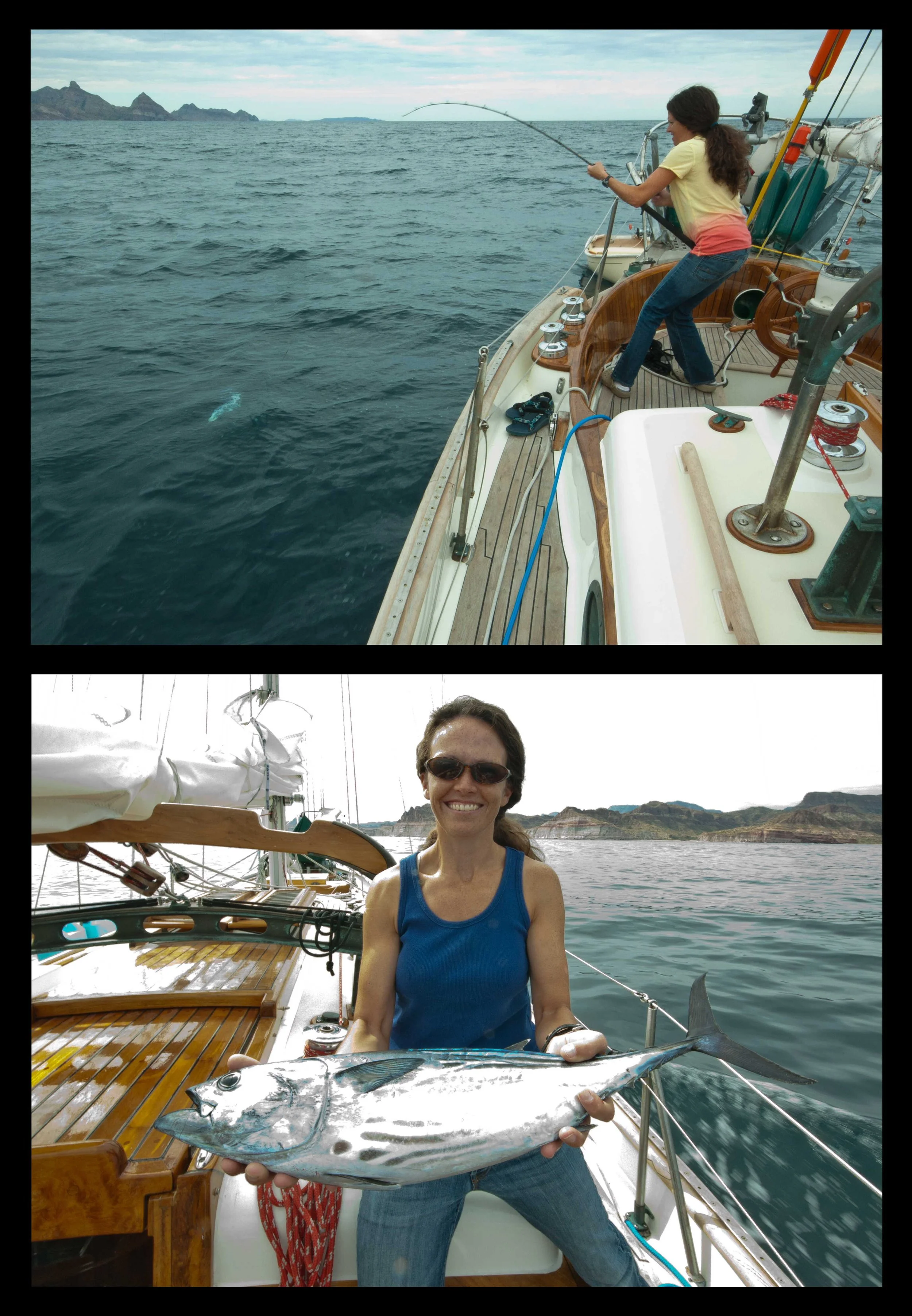 Reluctantly, we left the following day for Timbabiche (Bahia San Carlos). There was an uncomfortable NNE swell of about four feet running with no wind, so we couldn’t get there fast enough. However, about five miles from Timbabiche, we had two tuna hit on our fishing lines at the same time. We managed to get both of them up to the boat, but decided to let the big one go. The smaller one was plenty of food for the two of us for the next couple days. It doesn’t feel right to let a fish go back, especially a nice sized tuna, but without refrigeration, it would go bad before we could eat all of it.