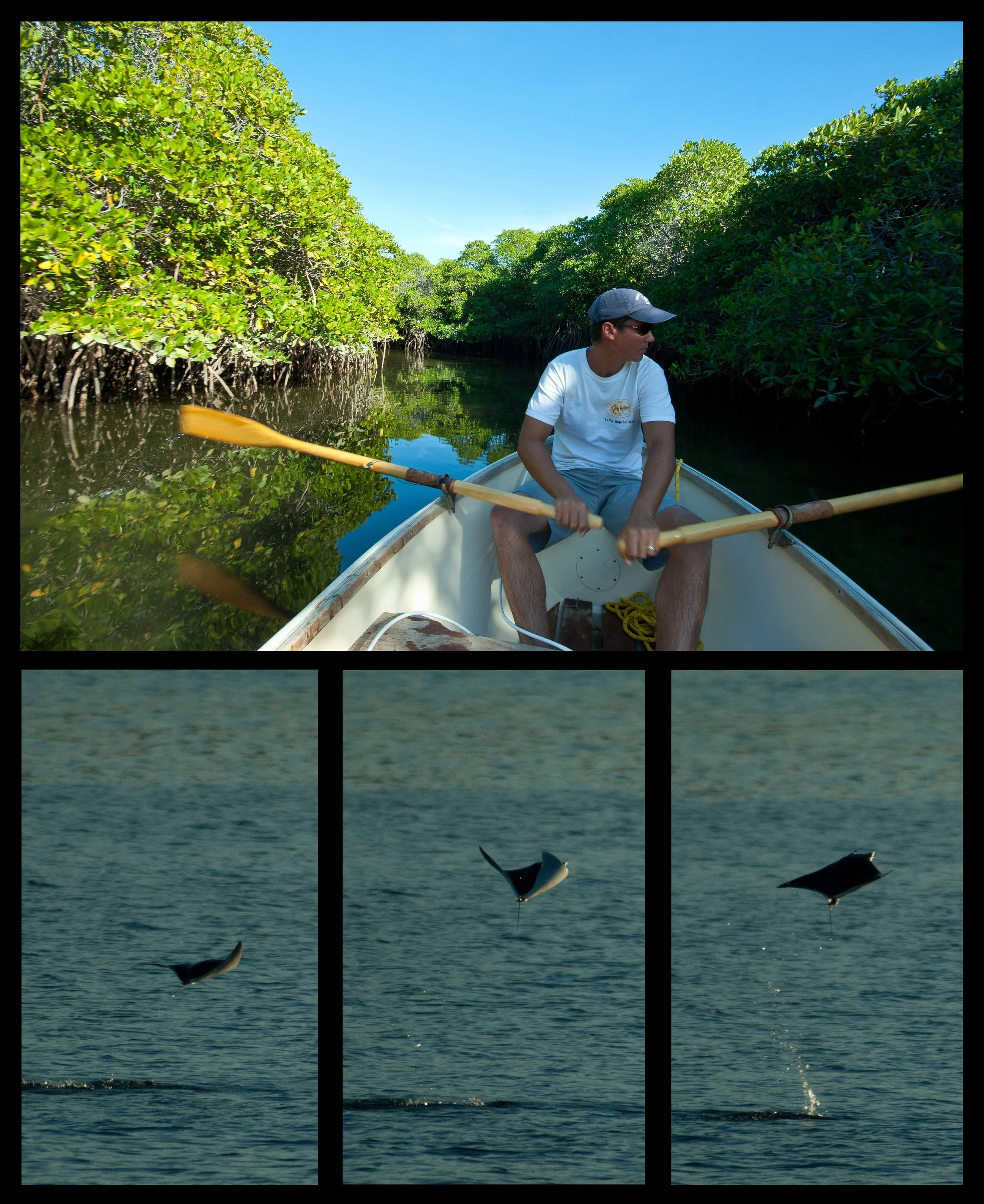 After we pushed and pulled the dinghy through the shoal areas leading to the entrance, we eventually made it through the deeper and slower moving waters of the mangrove-lined channels. These channels wind through to the large lagoon to the other side. We had a good time exploring the channels and the lagoon and watching all of the birds and fish that inhabit the area. On the way back to the boat, the manta rays started jumping, some very near the dinghy. We spent the last couple hours before sunset watching the rays jump out of the water all around the boat.