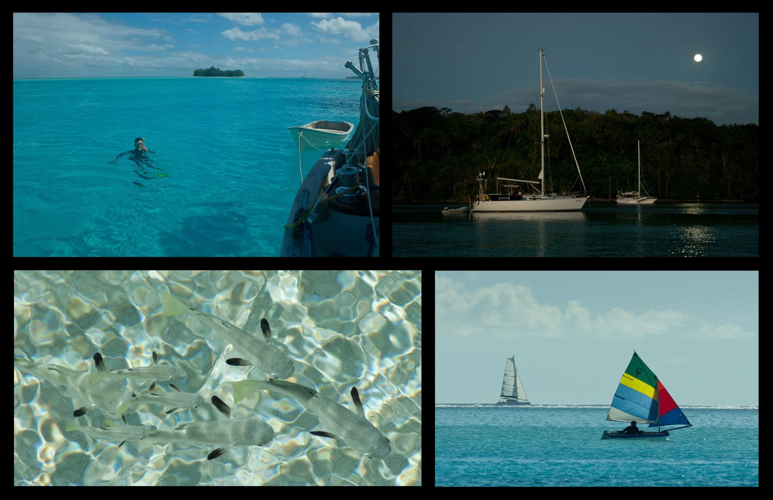 After we provisioned, we decided to spend a couple days relaxing and headed back to our favorite anchorage off Ile Toopua. We anchored in the same spot as when we first arrived, and spent three really nice days there with very calm winds and clear skies. With the nearly full moon, we were able to see our anchor chain in the sand and the fish swimming around the boat through the night almost as clearly as we could during the day. Andrew spent a couple hours a day scrubbing the growth off the bottom of the boat, since we hadn’t done a good job of that since Mexico.