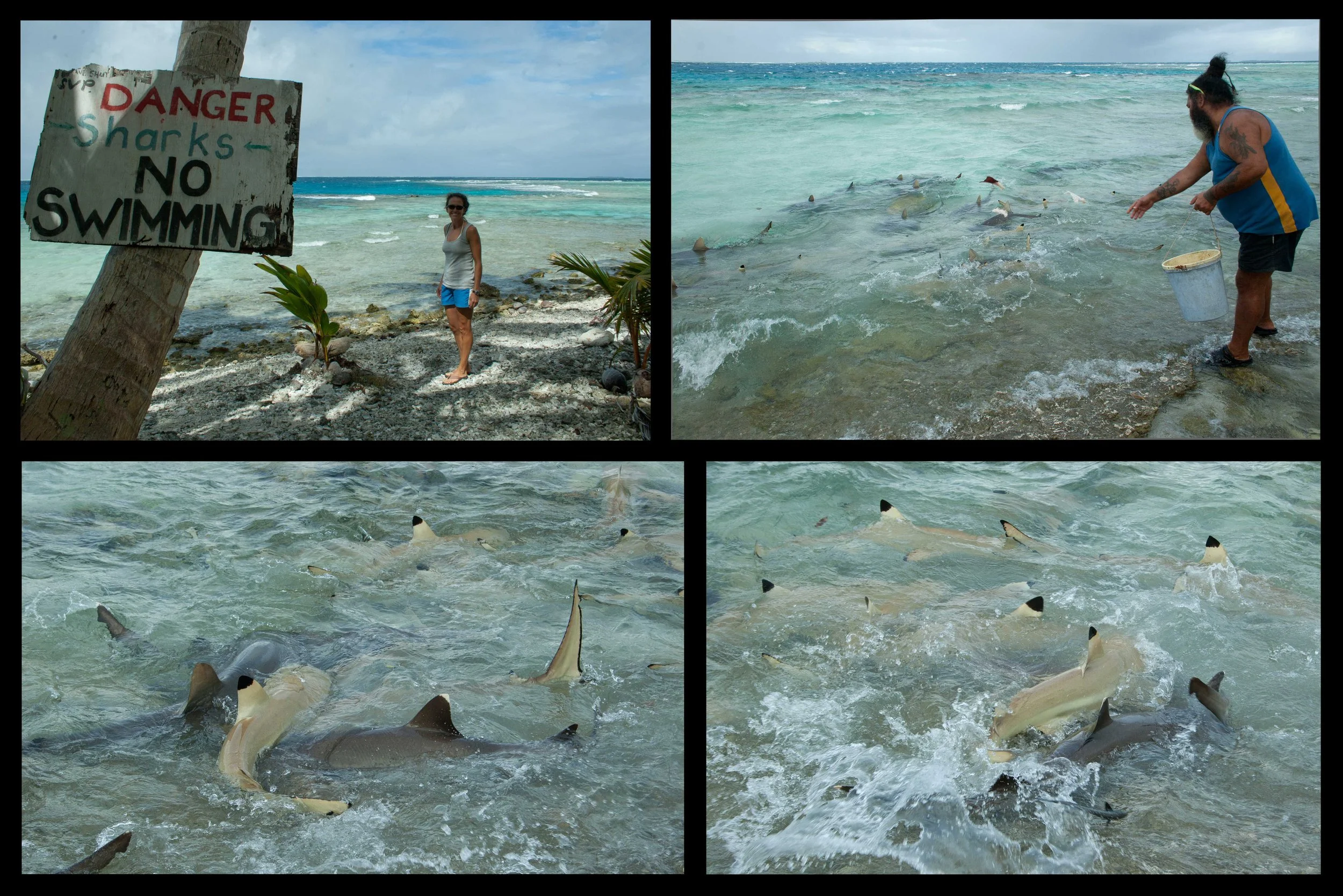 About 15 feet from the water, James yelled at the sharks and about 20 of them shot over to the shallow end to wait for him. Over the next couple minutes, he stood in ankle deep water as the black tips, white tips, and a few larger gray sharks thrashed around trying to snatch up the fish parts. They were bouncing right off the reef in a few inches of water very close to James, and we asked if he was worried about getting bitten. He told us that the previous ranger was bitten while doing that, but he wasn’t worried. He said that if they got to close, he would just “give ‘em the boot”. “The boot” on an island in the South Pacific is actually a flip flop or a pair of crocs. He was very nonchalant as he stepped on the heads of sharks that were swimming to close to him. That night, we had our first full night of sleep without anchor watches, 10 nights after leaving Bora Bora.