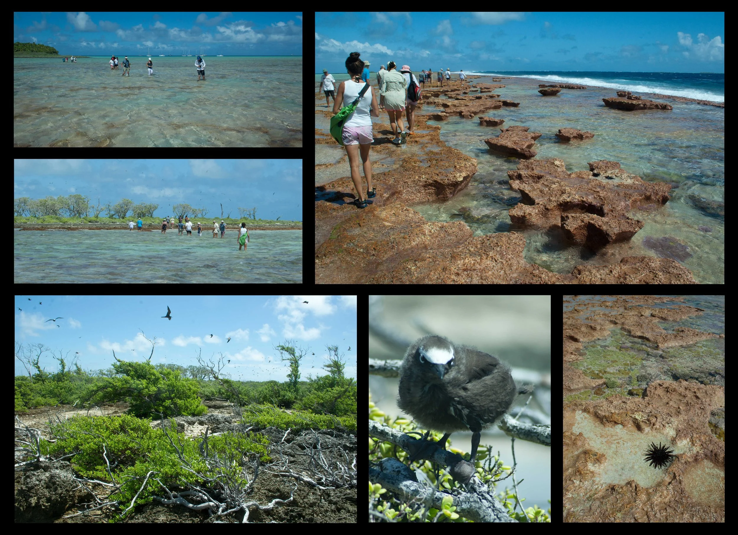Saturday morning, James invited everyone to join in a reef walk. So at 10:30 am, 30 of us set out wading through the shallow water north of Anchorage Island, making our way to the fringing reef of the atoll. At low tide, it was shallow enough for us to walk along a drying section of the reef. He warned us to stay away from the Pacific Ocean side so we didn’t get washed away when some of the larger waves crashed down. The colors and marine life were incredible, and after an hour of walking along the reef, we had made it to Whale Island, where lots of noddies have nests. There were birds everywhere, very similar to the sight on Isla Isabella in Mexico.
