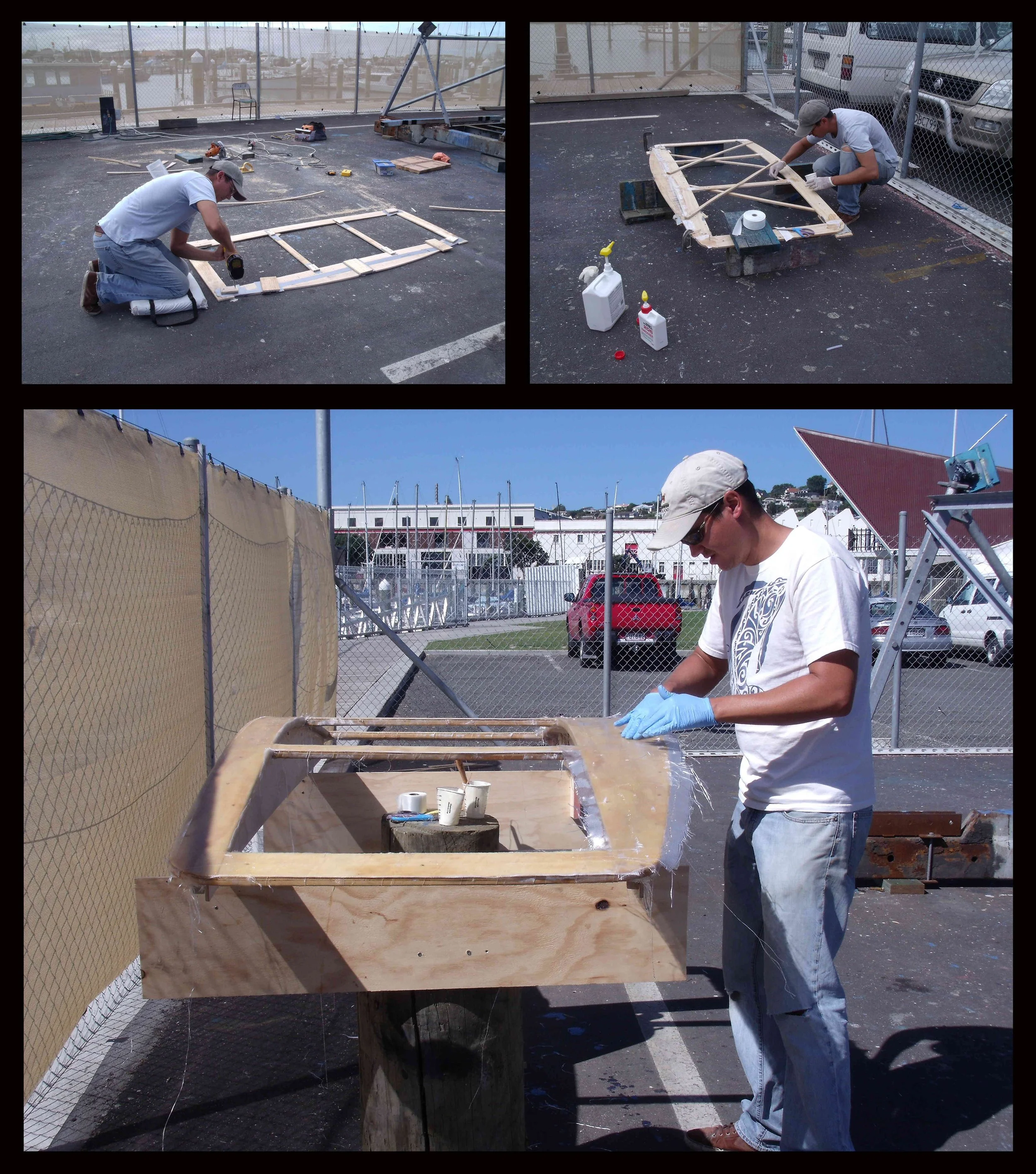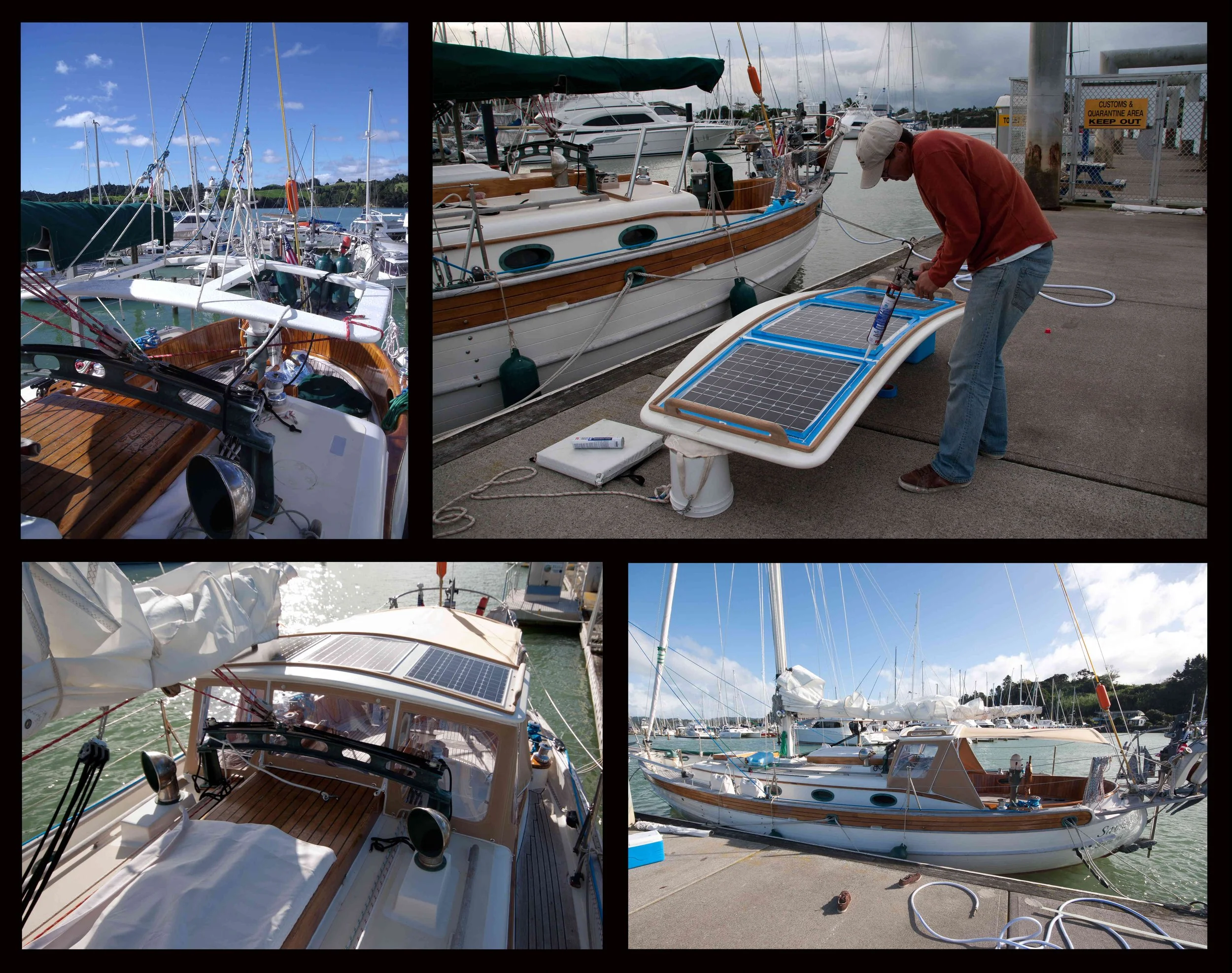 Back in Napier, Andrew was anxious to start building a dodger that he had been thinking about over the last year. We decided to build a hard dodger that would not only protect us from the elements, but would incorporate some new solar panels, a rainwater catchment system and would be wired for lighting so we could see the lines and winches in the cockpit at night. There was a small boatyard right next to the marina, and the manager let us use a corner of the yard for a couple weeks for a nominal fee. One of the local lumber yards gave us some throw away packing crate wood, which Andrew cut up and shaped to form the frame of the dodger.