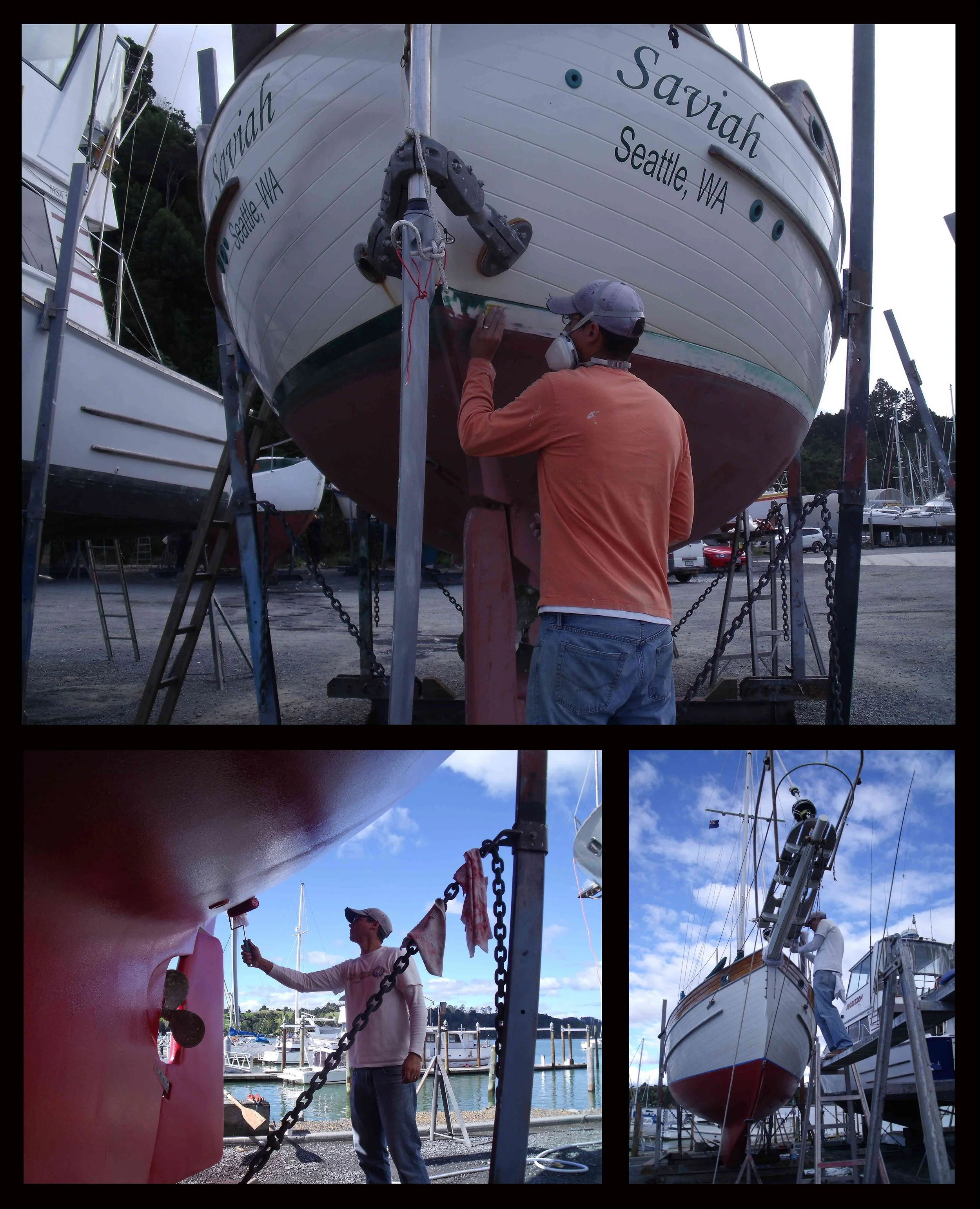 The next morning we continued on to Opua and had the boat hauled out at Ashby’s boatyard a couple days later. We sanded down what was left of our boot stripe and put bottom paint on it, which raised our waterline by a few inches. We also put a couple of coats of paint on the rest of the bottom and replaced our zincs.