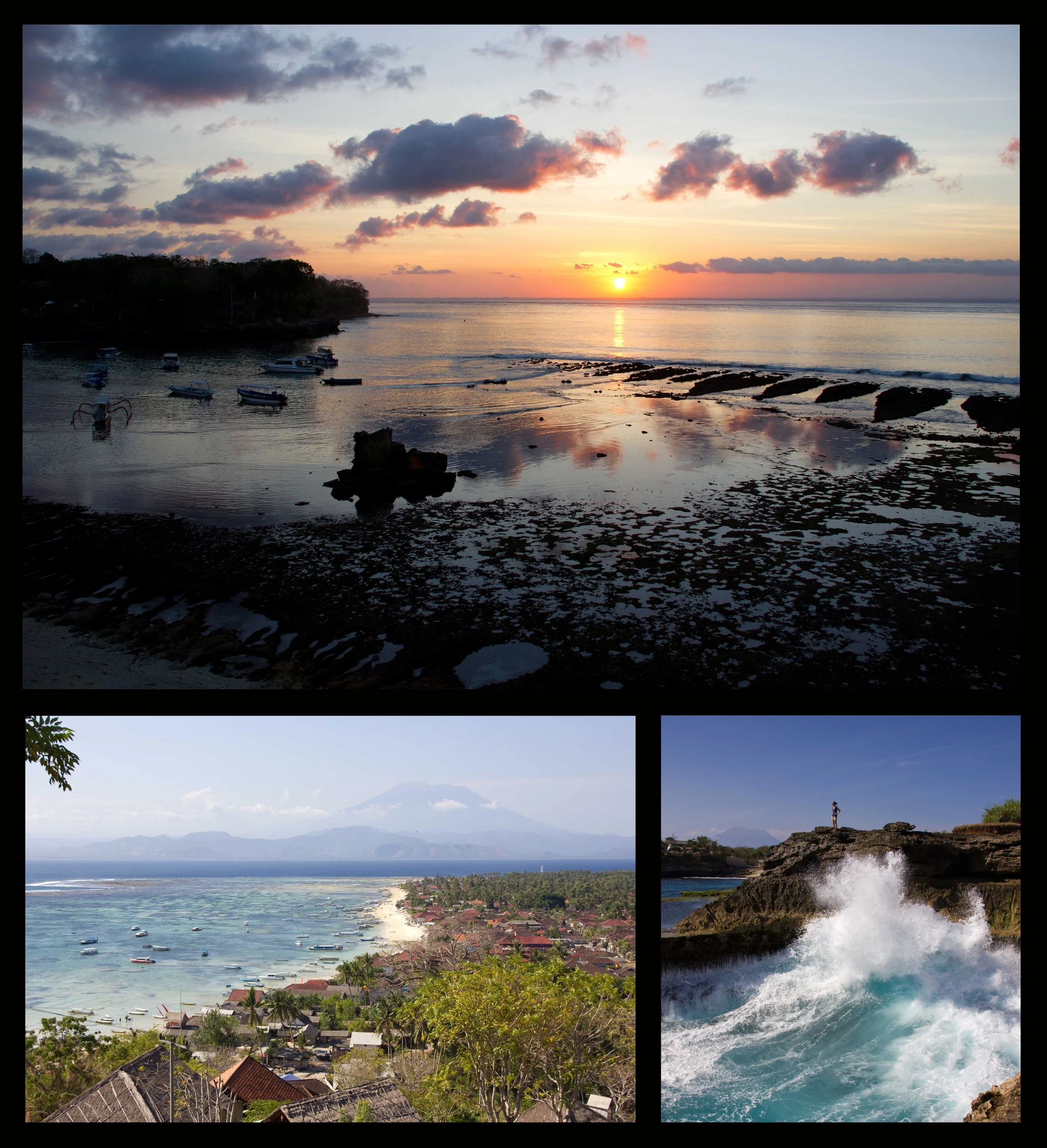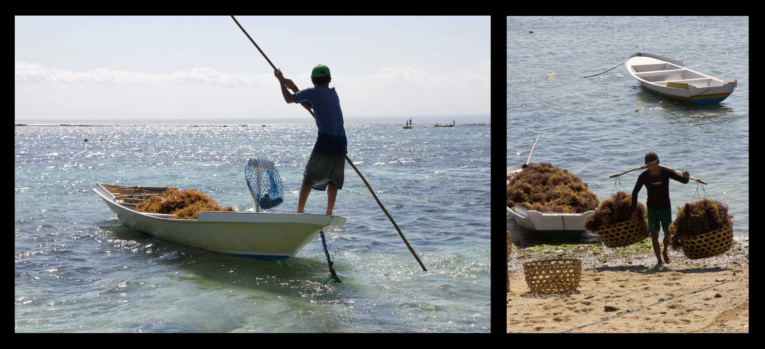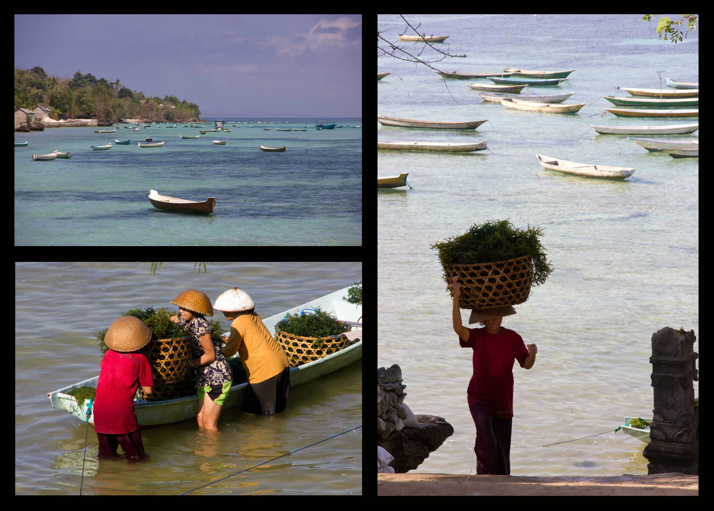 We spent a couple nights at our hotel in Mushroom Bay. There was a nice beach out front and a fringing reef that provided protection to the shallow waters along the northwest side of the island. The shallow waters within this reef make a nice area for growing seaweed, which is what many of the local people do for a living. It was interesting to see the Balinese people harvesting the red and green seaweed, piling it high into their small boats. After rowing to shore, they load it into baskets and carry it off to spread it out so it can dry. It looked like hard work.