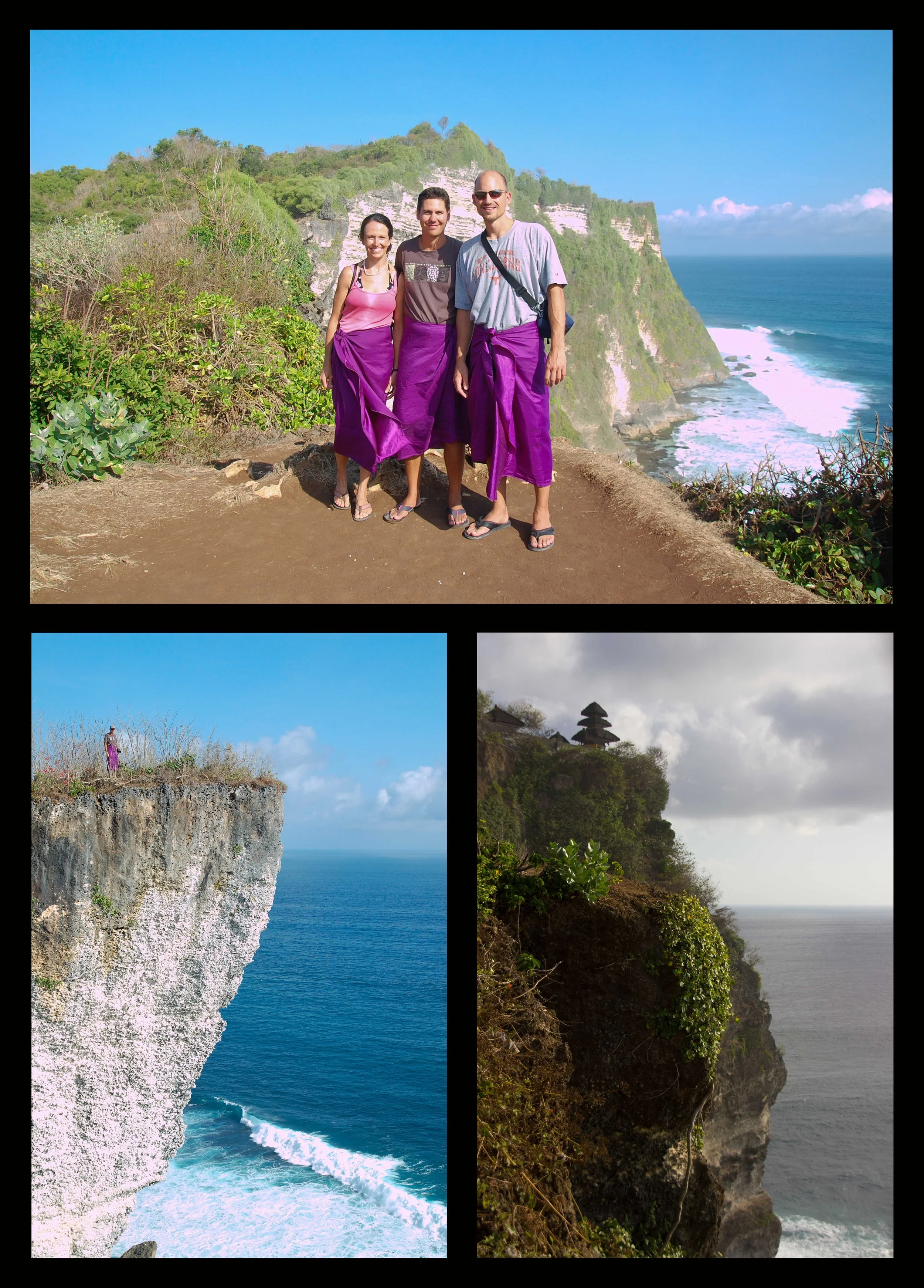 After hanging out for a while on the beach and going for a swim on the reef, we headed back out for the short ride down the road to see the temple, Pura Luhur Uluwatu. We rented the required sarongs, and took a walk around the temple compound, which has a resident troop of monkeys that are known for being quite aggressive. This temple is not one of the more beautiful on the island, but it is situated right on the edge of a cliff. You can walk for quite a distance along the cliff tops in either direction from the temple and see some really nice views out over the ocean.