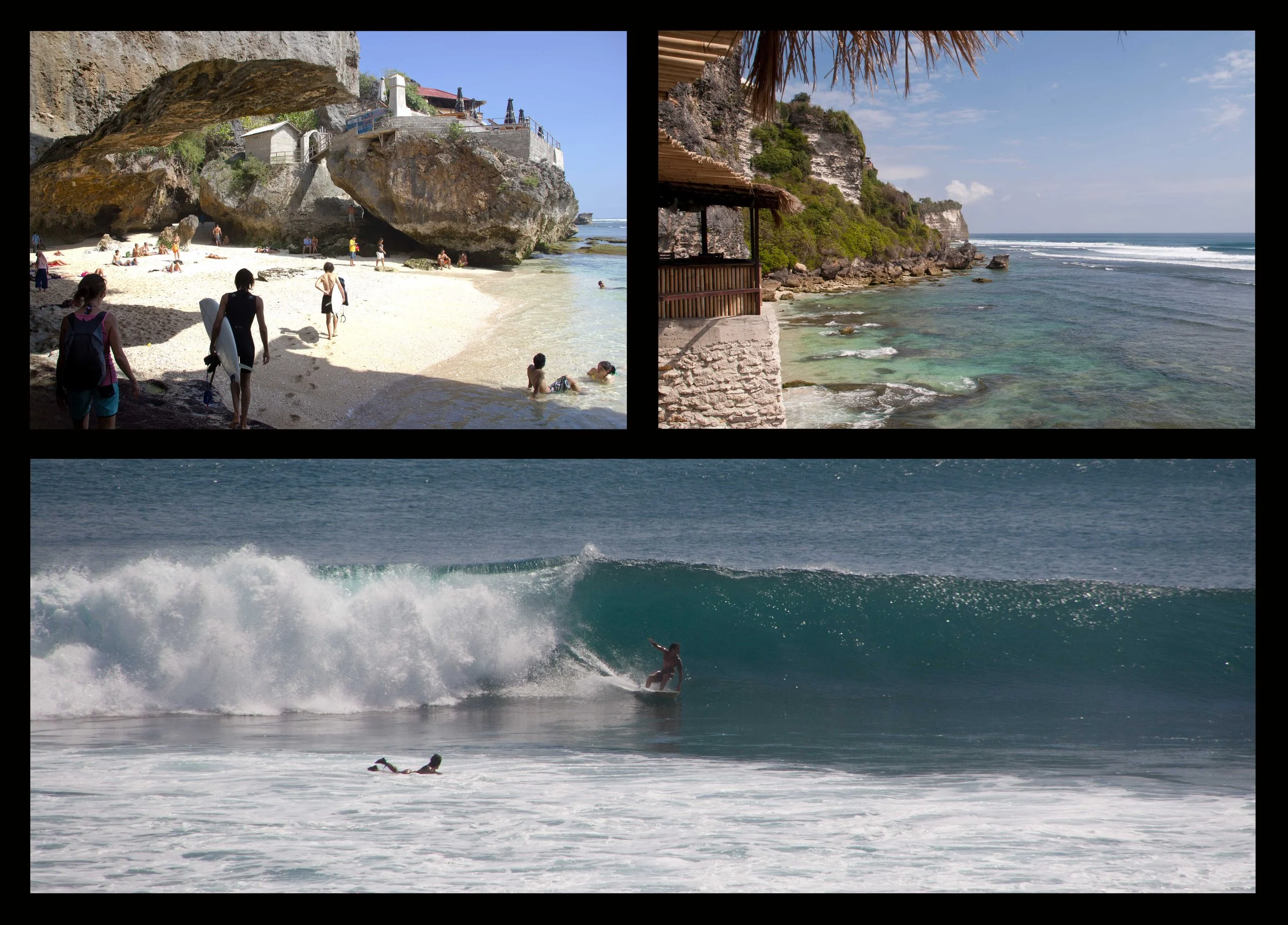 On our first afternoon, we rented scooters and made our way to the southwest end of the island. We had a nice ride over, as this area is less crowded and the roads wind along the tops of the cliffs, offering great views over the ocean. Our first stop was at Uluwatu, on the southwest end of the island. This place is a popular surfing spot with world-class breaks, as well as a nice beach and swimming and snorkeling on the reefs.