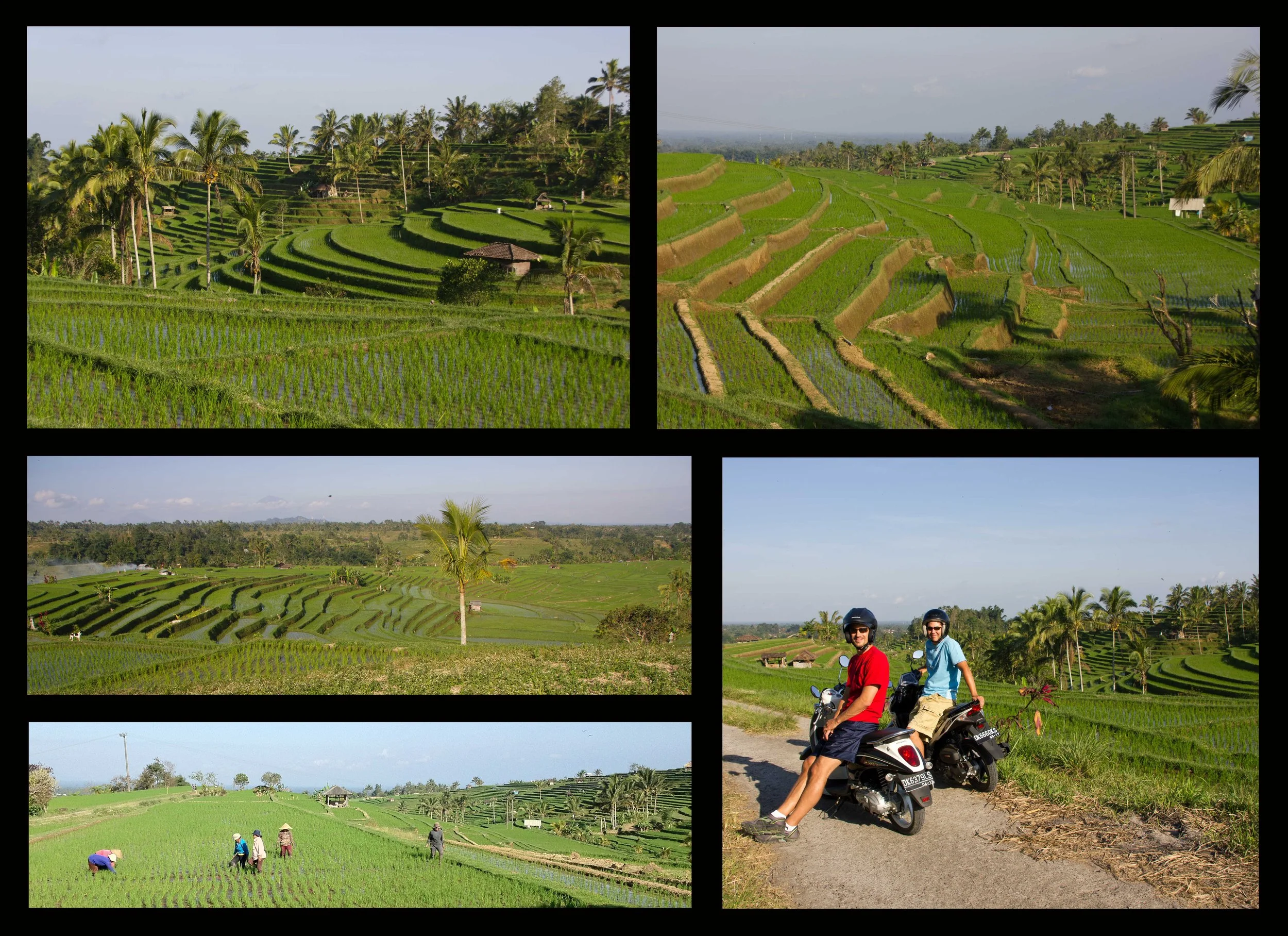 After several days in Nusa Dua, we relocated north to Ubud. We rented scooters again for the day to do a tour of the rice fields. There are a lot of rice fields in the Ubud area, but we decided to drive a little further and see the more impressive fields further north at Jatiluwih. This area is located on the fertile southern slopes of Gunung Batukaru, Bali’s second-highest peak. Although the area is not a long way from Ubud, the traffic was heavy, and it took several hours to get there. By the time we arrived, it was late in the afternoon. Unfortunately, this left us only an hour to ride around and see the fields before we would run out of daylight and have to head back. Although it was a bit of a hassle getting there, it was definitely worth it. The views of the tiered rice fields seemed to go on forever, and we really enjoyed riding the scooters through the narrow pathways that wound through the rice fields. We even watched some of the locals harvesting the rice, which seems like very hard work as it is all done by hand.