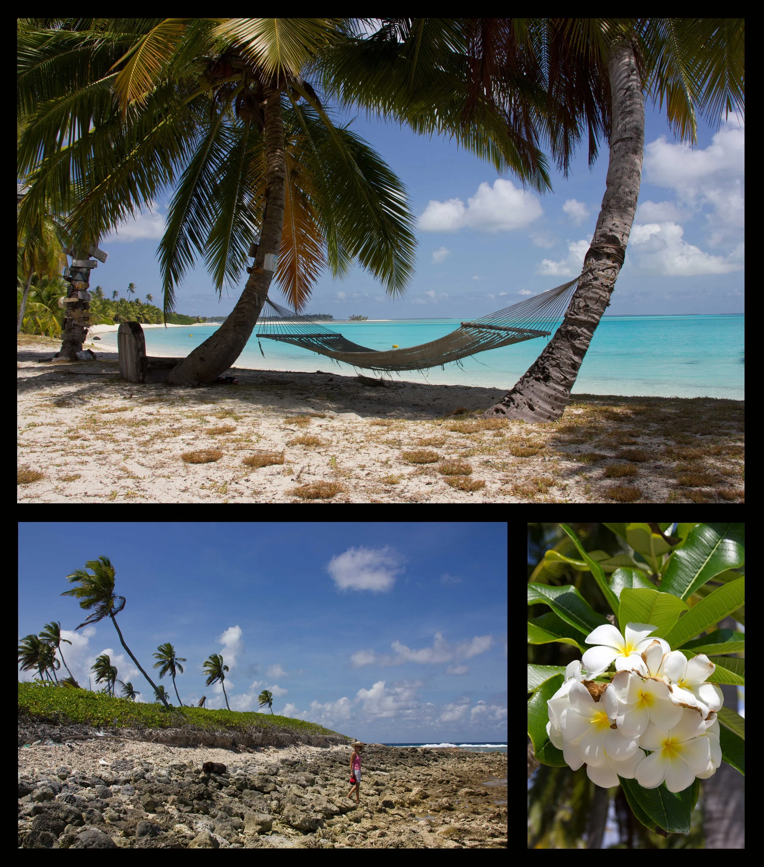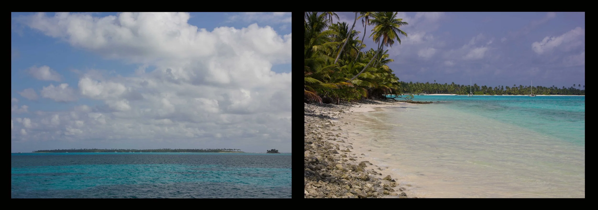 The third largest island is Direction Island, on the northeast side of the lagoon, which is uninhabited and where we were instructed to anchor. As we approached the entrance to the lagoon, the depths dropped drastically to 60 feet, and the water was crystal clear. Motoring through the pass, we were accompanied by a pod of dolphins and could see two other sailboats in the anchorage. As we approached the anchorage, the dolphins dispersed and a dozen black tip reef sharks took over, circling below the keel as we anchored in 15 feet of turquoise blue water over white sand. After almost eight days at sea, we savored the beautiful scenery and flat calm water.