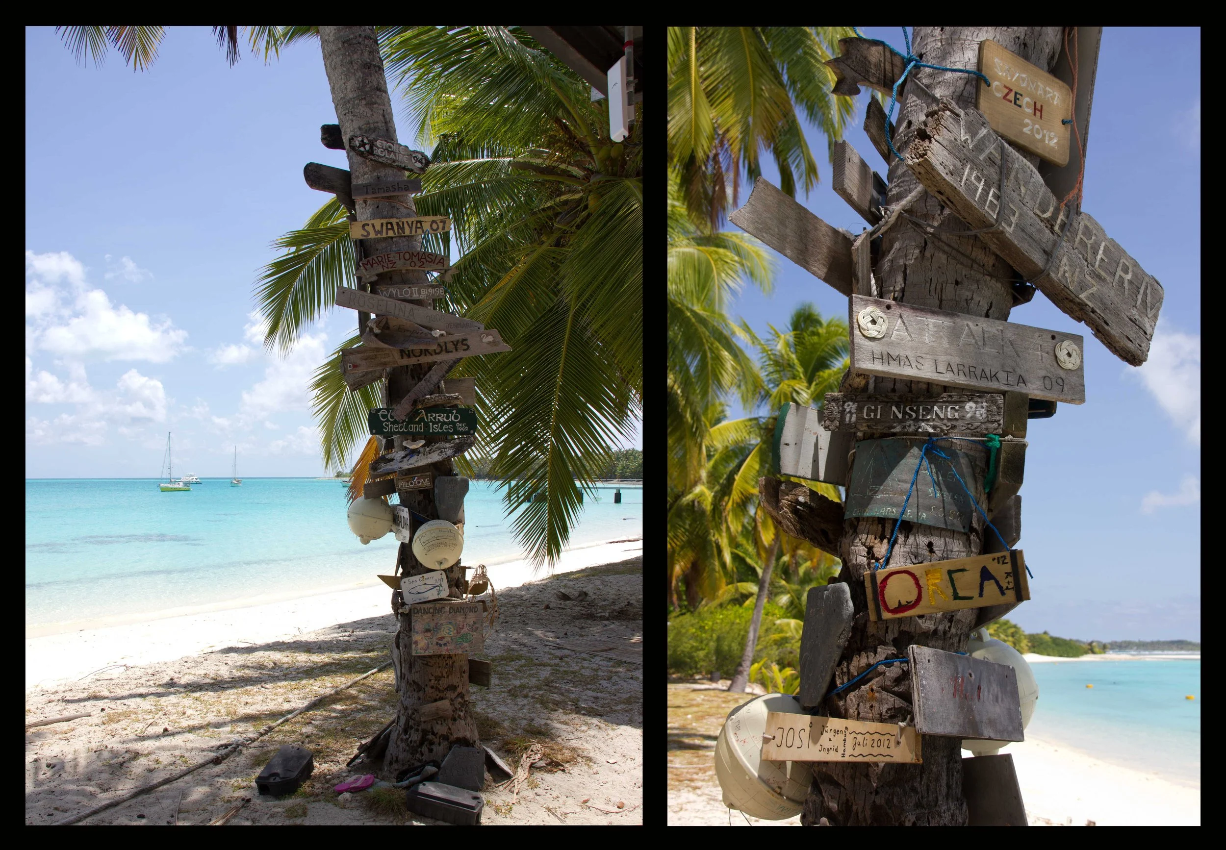 For many years, Cocos Keeling has been an important stop for cruisers crossing the Indian Ocean. The shelters near the beach have barbecues, and there are frequent potlucks on shore when there are boats in the anchorage. Many cruisers that have passed through have carved their boat names on pieces of wood and nailed them to the palm trees on shore. It was interesting to look at the names and home ports of the sailors that have stopped in, some of them from decades ago.