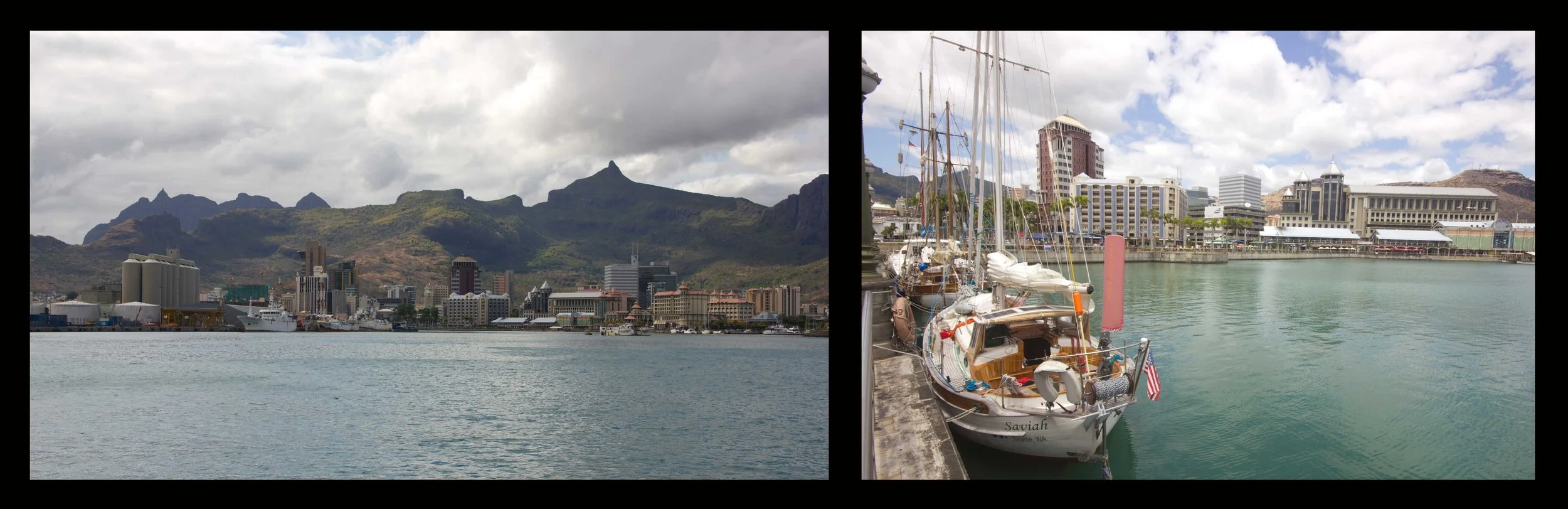 As we approached the harbor entrance to Port Louis, we reduced sail to slow down. This is a busy commercial port, and the entrance to the channel was currently blocked by a large freighter being turned around by three tugs. Once the freighter was clear of the entrance, we hailed port control on channel 14 and received permission to enter the narrow channel. By 8:30 am on October 10th, we were safely docked alongside the customs wall in downtown Port Louis, relieved to have completed one of our most daunting passages.