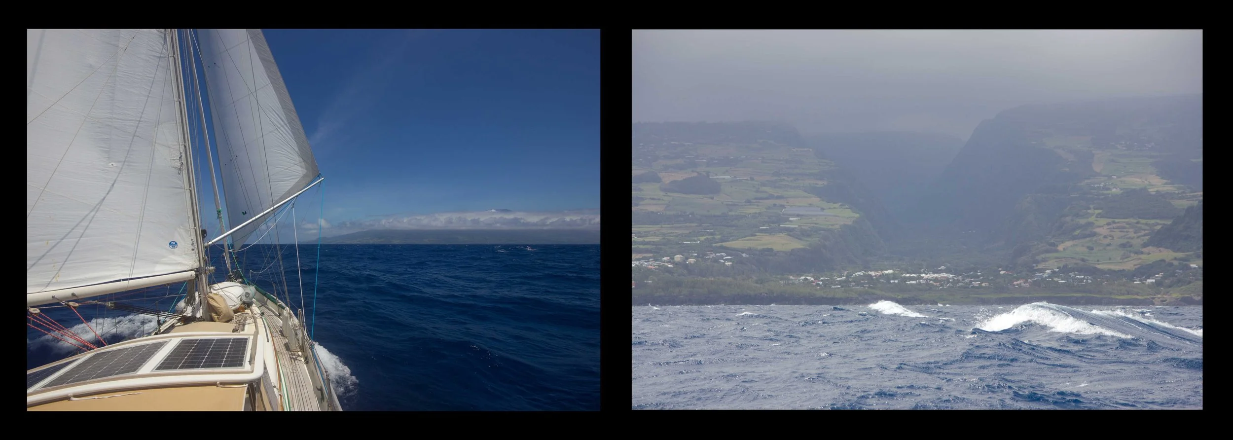 We set sail from Mauritius on October 19th, for Reunion Island, 140 miles away. Winds were light during the afternoon, but finally filled in at SE 15-18 knots around sunset. Saviah was making 5-6 knots with a single-reefed main and jib for most of the night. Reunion is about 40 miles long and 30 miles wide with several very tall peaks, making it visible from far away. When the sun rose on Saturday, the mountainous cloud-covered island came into view.