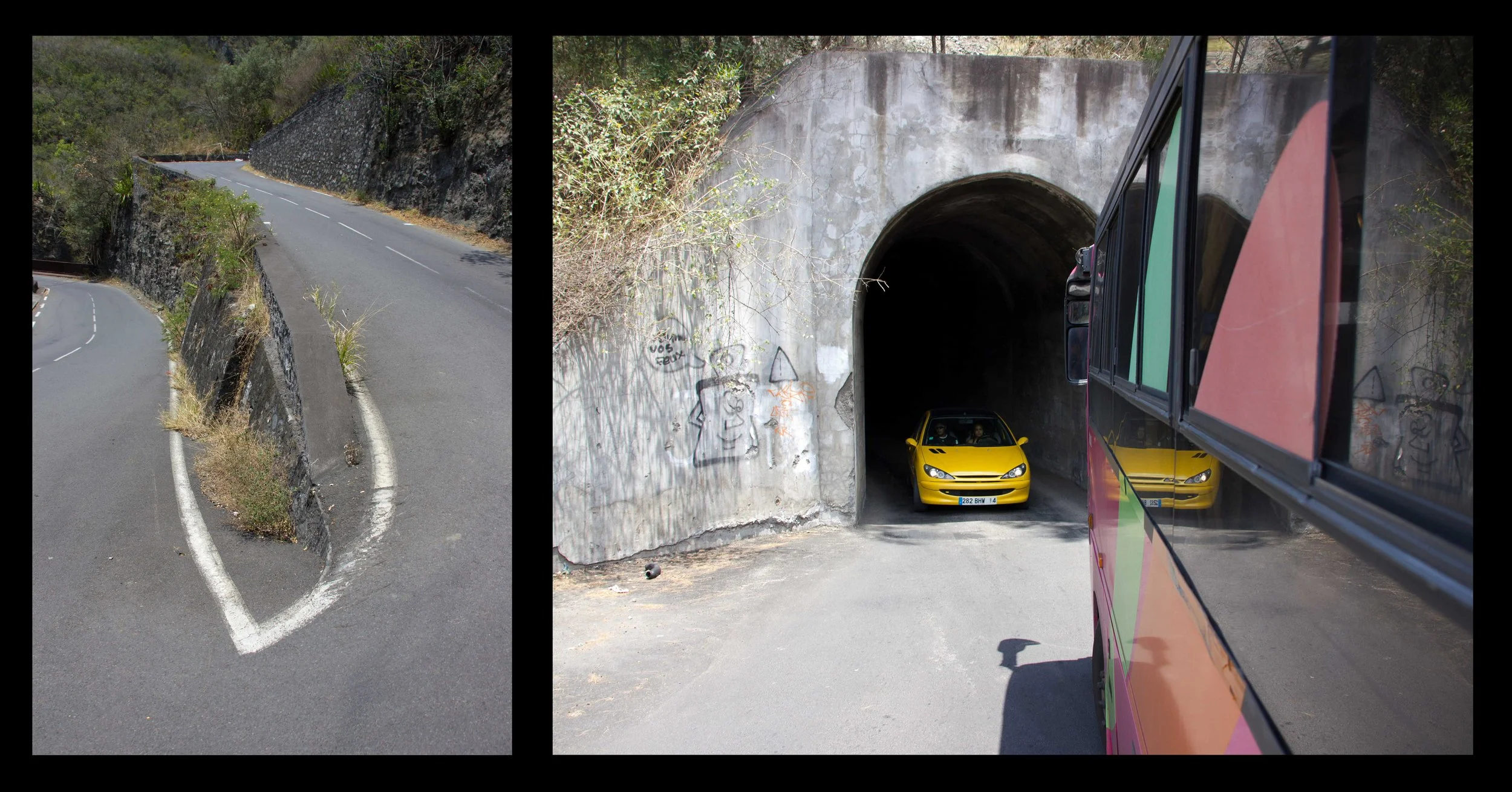 The bus trip to Cilaos was an experience in and of itself. It involved traversing the RN5 through the mountainous terrain, with more than 400 twists and turns along the way. Many are hairpin turns that seem impossible to maneuver in a full size bus. Sometimes the bus driver had to stop and back up a few times to make it around. This is probably why the busses had major scrapes along the sides. There were several tunnels along the way that were just one lane and barely wide enough for the bus to fit. The driver had to stop, pull in the mirrors, and wait for oncoming traffic before proceeding. The tunnel walls were just a few inches from the bus on either side.