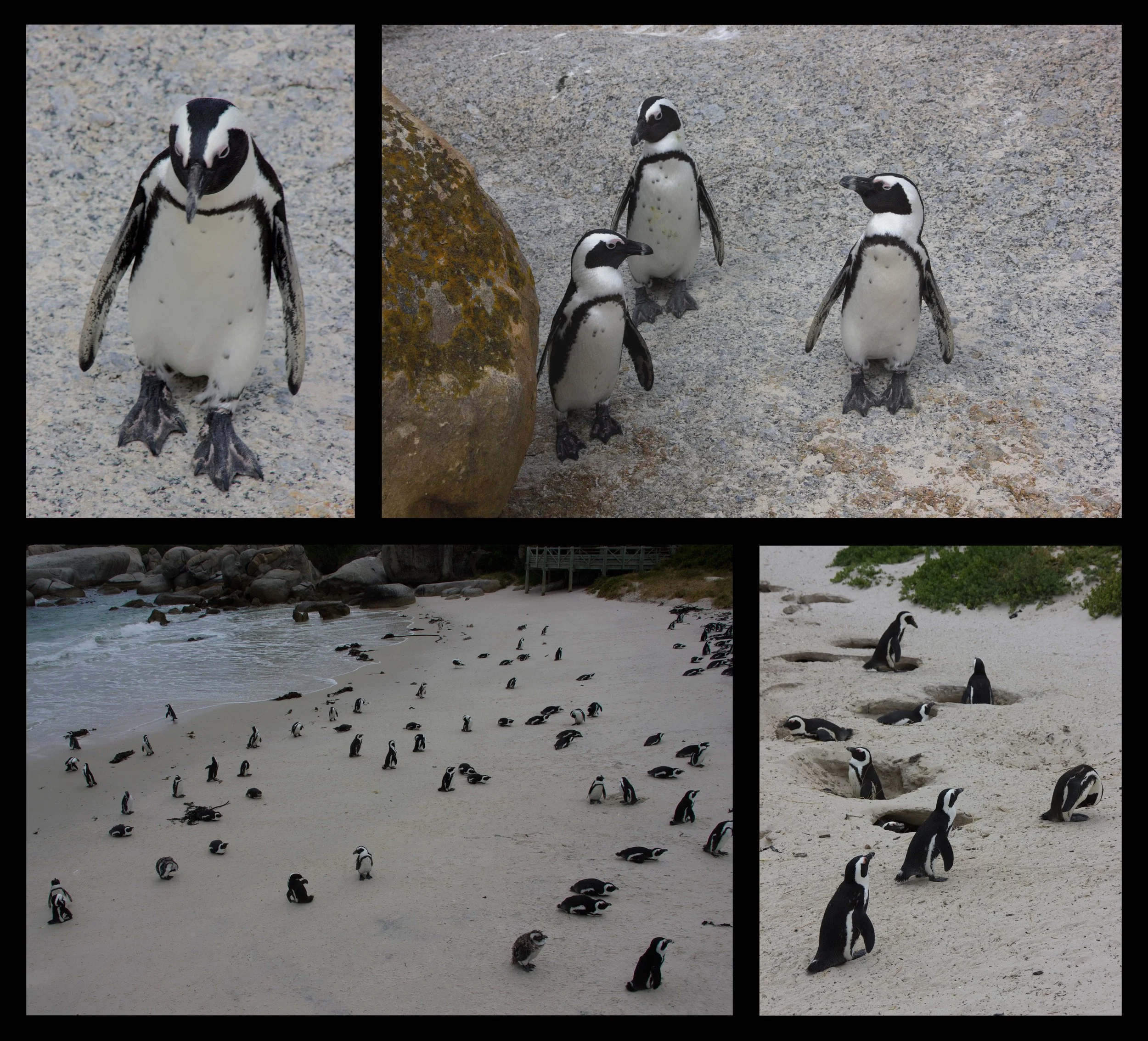 After the cape, we drove back north following the eastern side of the peninsula and stopped near Simon’s Town to see the colony of African Penguins that live in the area. These penguins are on the endangered species list, but there are over 2,000 of them in False Bay, living off mainly squid and other shoal fish that flourish in these waters. The beach where we first spotted them was also a popular swimming area, and it was surprising to see people sunbathing and wading in the water alongside these animals. A little further north there was another viewing area with a boardwalk to keep people off the beach. There must have been hundreds of penguins here walking around and sitting in their shallow pits in the sand. Since these birds can’t fly, they have to dig their nests in the ground, which makes their eggs easy prey for other animals.