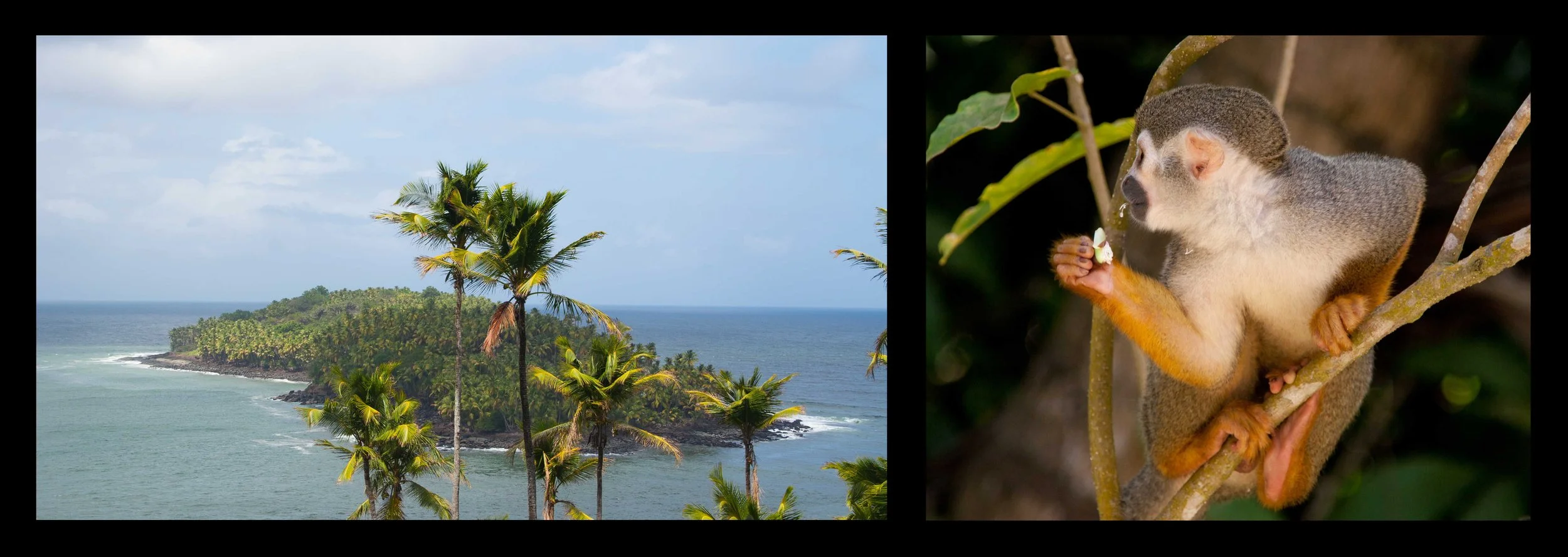 View of Ile du Diablo from Ile Royale, curious monkey on Ile Royale