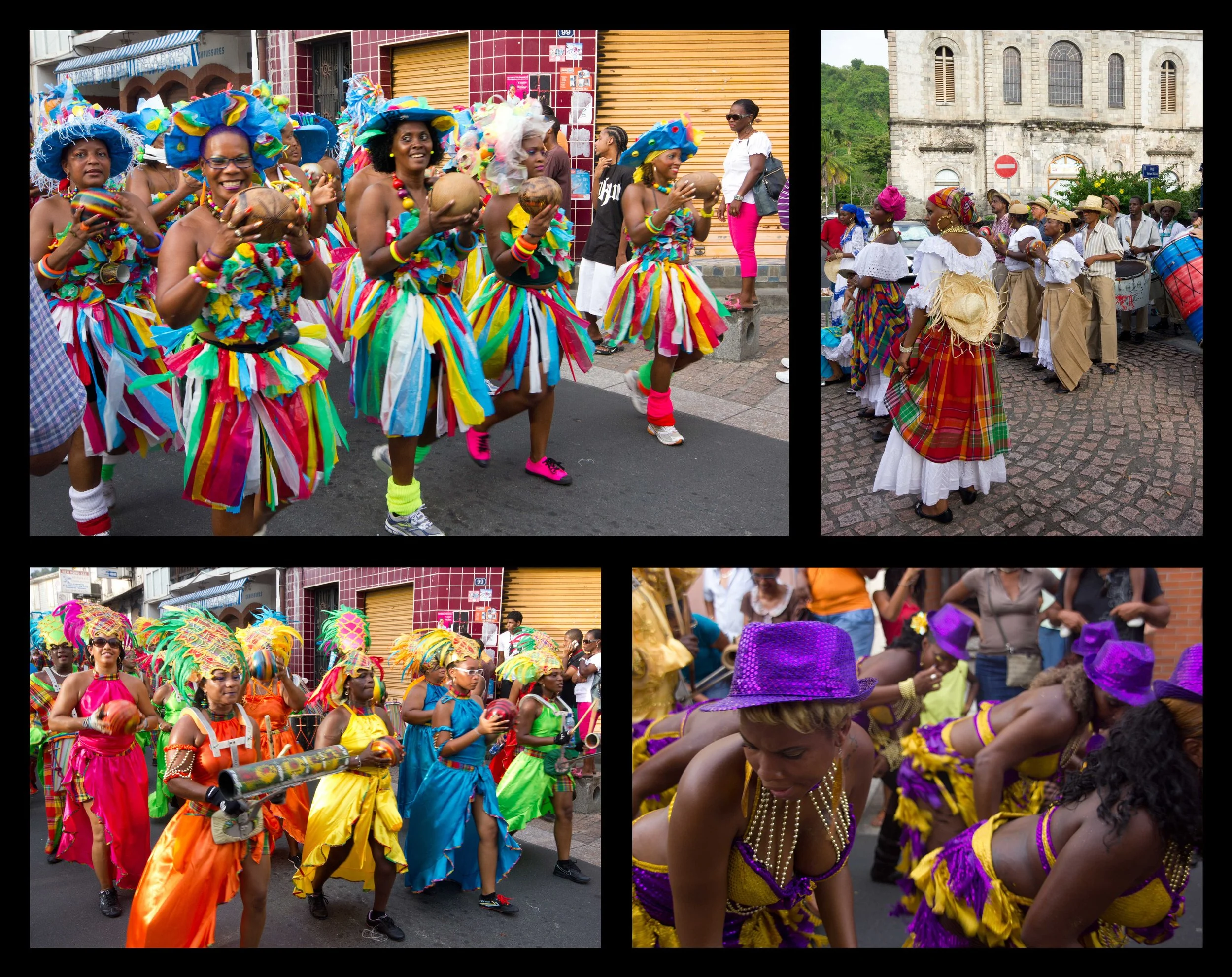 The next day, we waited for signs of the yole race, but nothing ever transpired. It was disappointing, but that evening, we heard a big commotion on shore and looked out to see the beginning of a parade. We hopped in the dinghy for another wet ride to shore, which was well worth it. Band after band marched down the main street, with people dressed in a variety of colorful costumes. Apparently this was part of the weeklong celebration leading up to Victory Day.