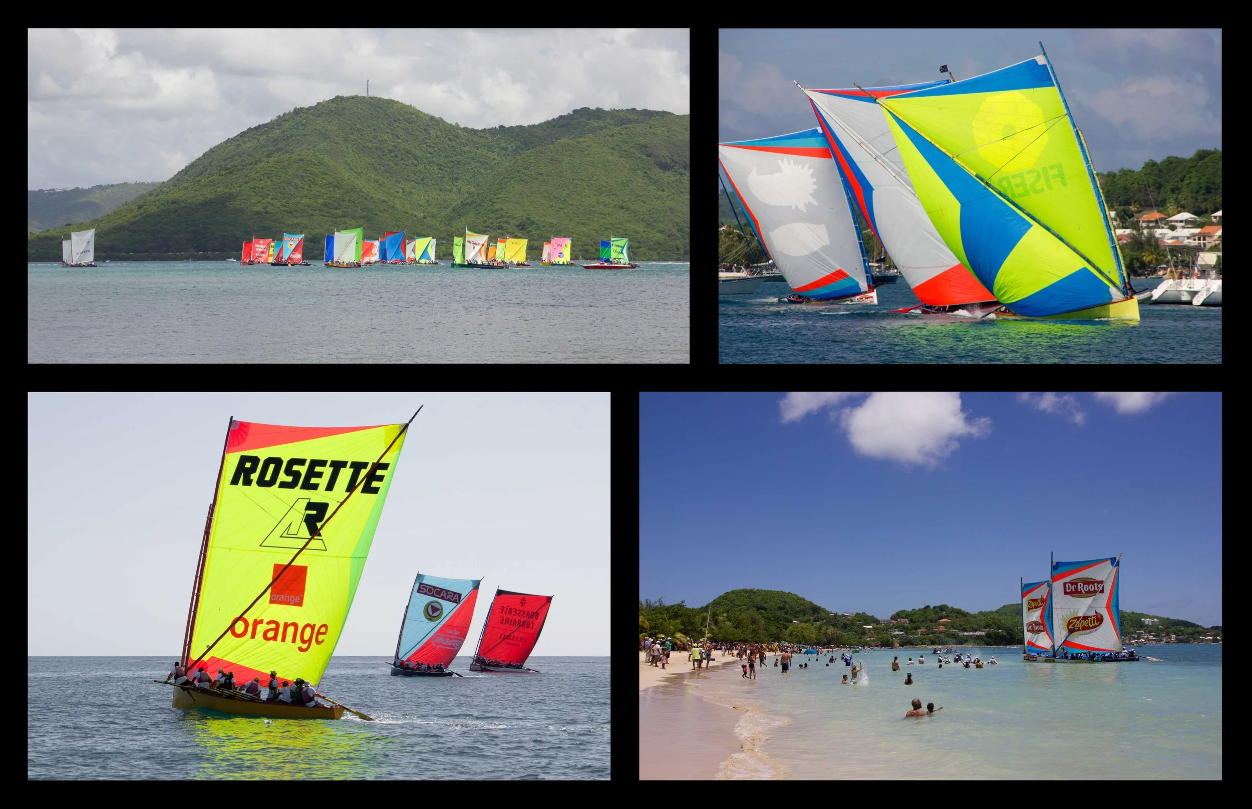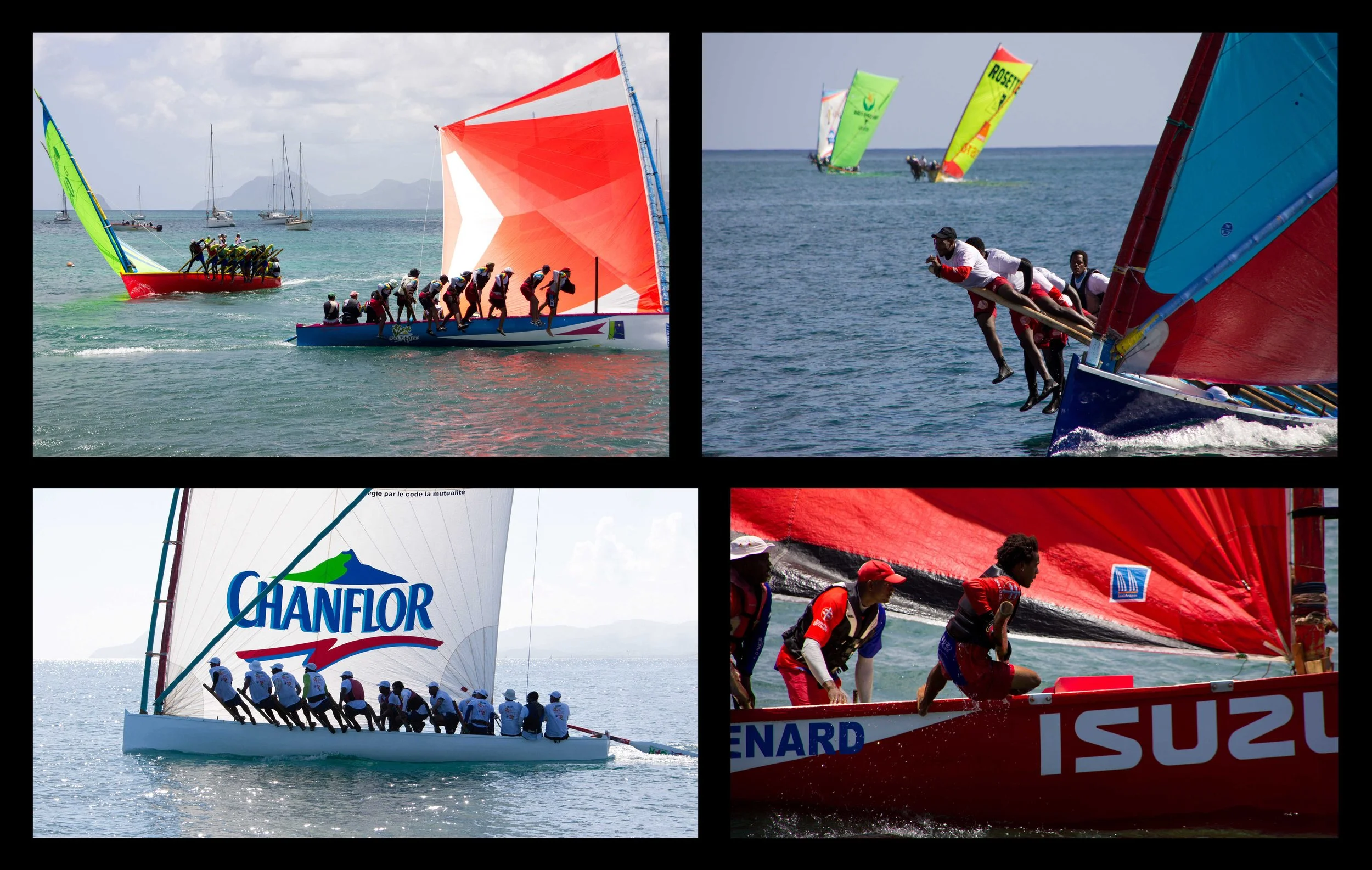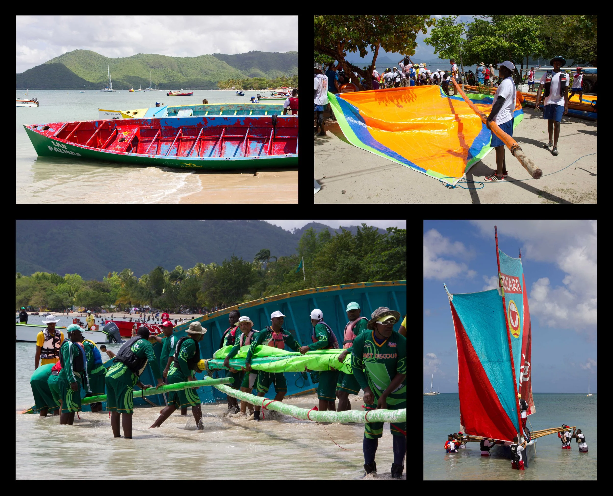 When we first arrived on Martinique, we saw pictures of these boats, but didn’t know anything about them. Apparently they are built in the tradition of Martinican fishing vessels from hundreds of years ago. The hulls are shaped like a big canoe and built out of wood from the local pear trees. Spars are made from giant bamboo poles and support rectangular shaped sails that are usually brightly colored.