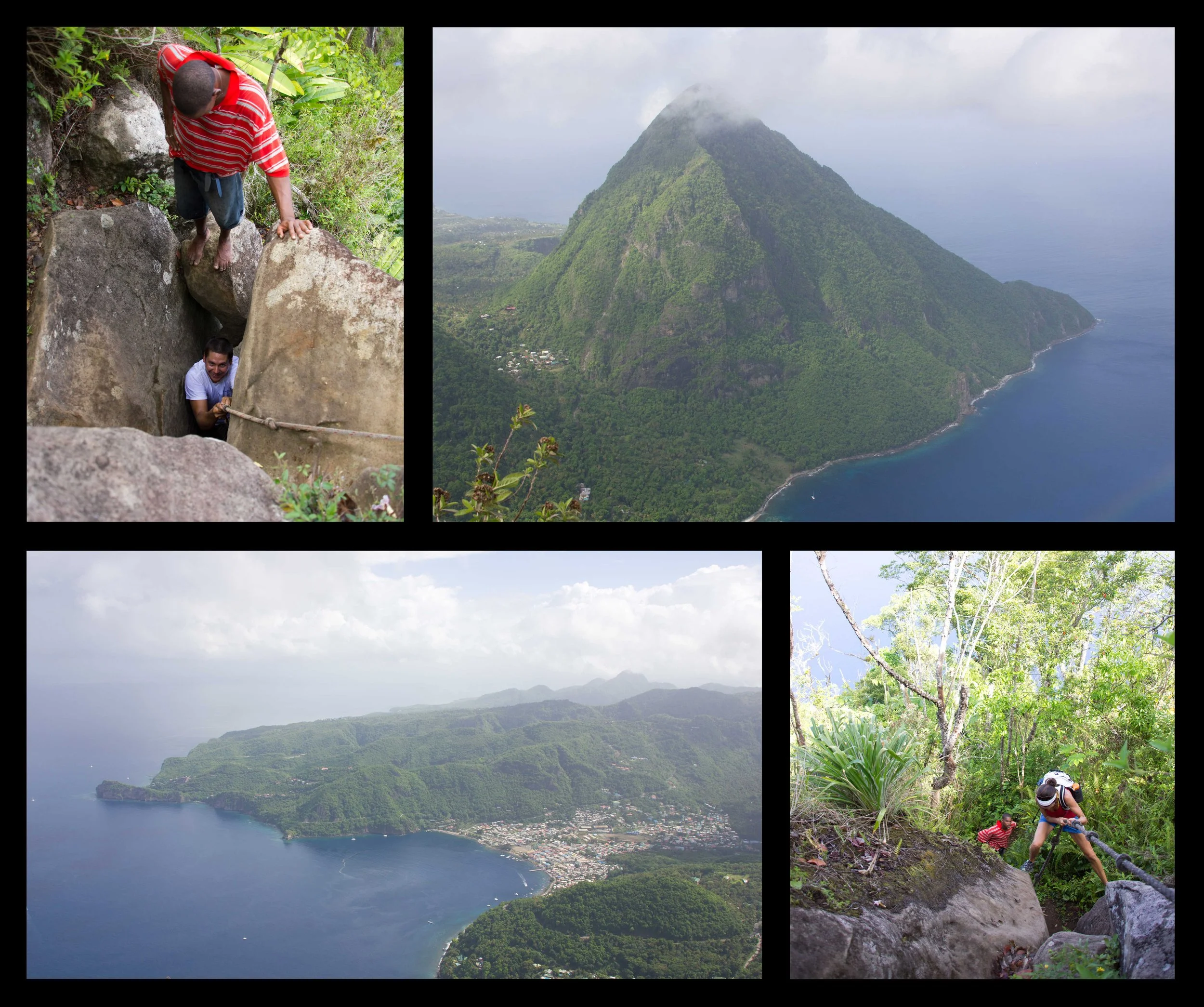 We moved to the moorings on the other side of the bay, and the next morning rowed to shore. Our guide, Manu, met us on the beach. We were glad we hired him because there is no way we would have found the trail on our own, and we also learned a bit about the island during the hike. It was overcast and drizzling for most of the way up and definitely a strenuous climb. There were a few tricky scrambles and several very steep sections where we needed ropes to scale large boulders. It took two hours to reach the summit, where on a clear day you can supposedly see Martinique 40 miles north. We weren’t able to see very far due to the clouds, but there were still great views of Gros Piton to the south and the town of Soufriere and the bay to the north.