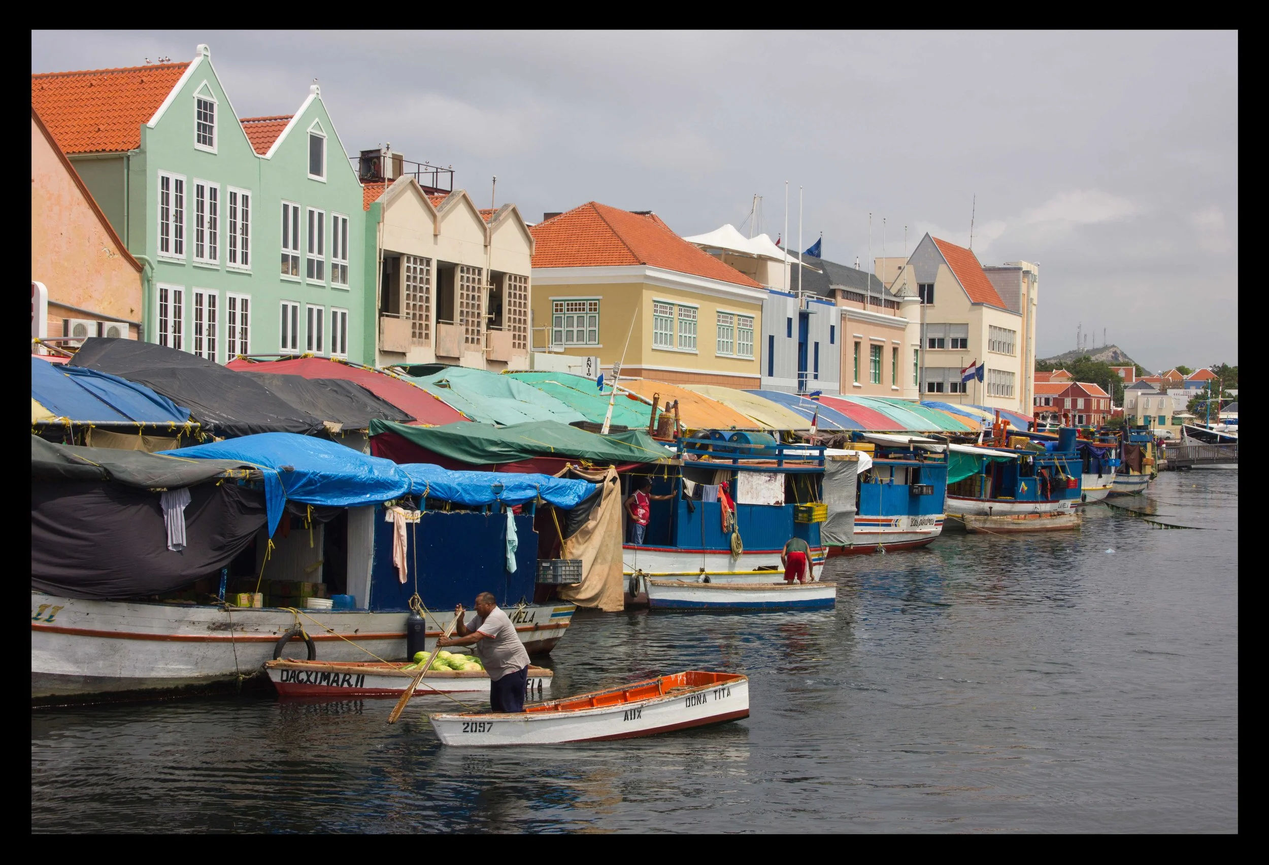 It was a thirty minute bus ride to the main bus terminal in Willemstad, the capital of Curacao. There are around 145,000 people on the island, which felt congested after Bonaire, and it had a somewhat industrial feel, with an oil refinery belching smoke near downtown. Right off the bus on our way to the customs office, we passed by the outdoor produce market. For centuries, the Venezuelan fisherman and produce vendors have been coming to Curacao to sell their goods. They dock their colorful boats right at the market. This made it easy to stock up on fruits and veggies anytime we came to town.