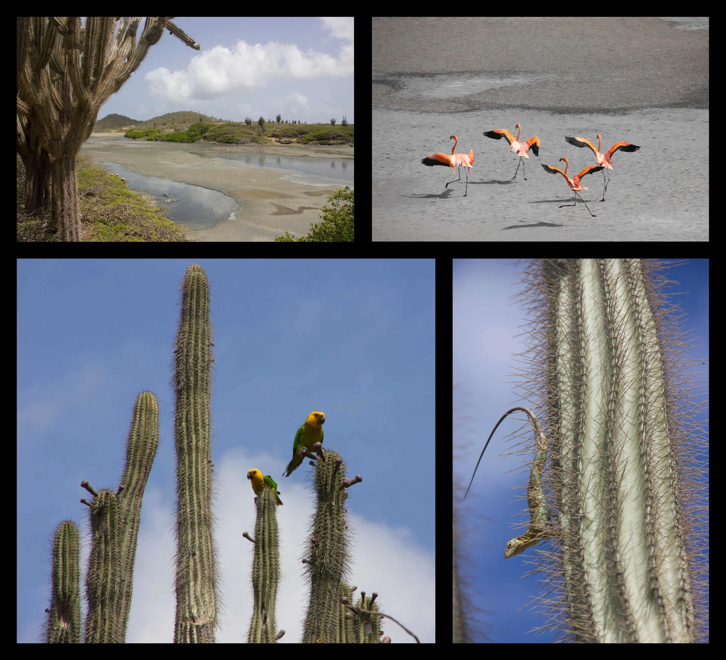 We wanted to get some exercise and see some wildlife, so our first stop was the Washington Slagbaai National Park at the north end of the island. Off-road vehicles are required to drive the park road, but several hiking trails start at the park entrance. We did two of them, including the short hike up to the highest point on the island, Mount Brandaris, at only 784 ft. There are many lizards and iguanas, as well as several hundred bird species in the park. We saw quite a few parrots feeding atop the cacti, as well as pink flamingos in the shallow brackish water, where they feed on the shrimp.