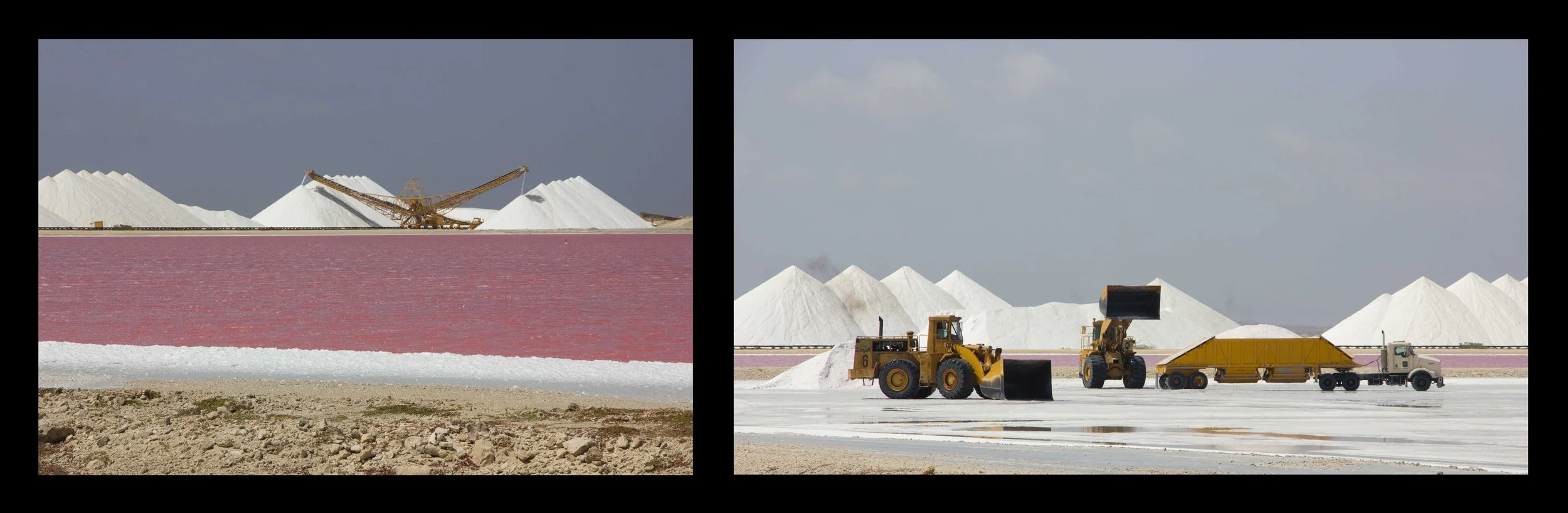 From Lac Bay, we continued south along the windward coast and down to the salt ponds. These huge salt pans were vivid colors of blue, pink and green, depending on the level of evaporation. There were tractors loading the salt onto trucks, which take it over to a conveyer belt, which then loads it onto the freighters in the bay.