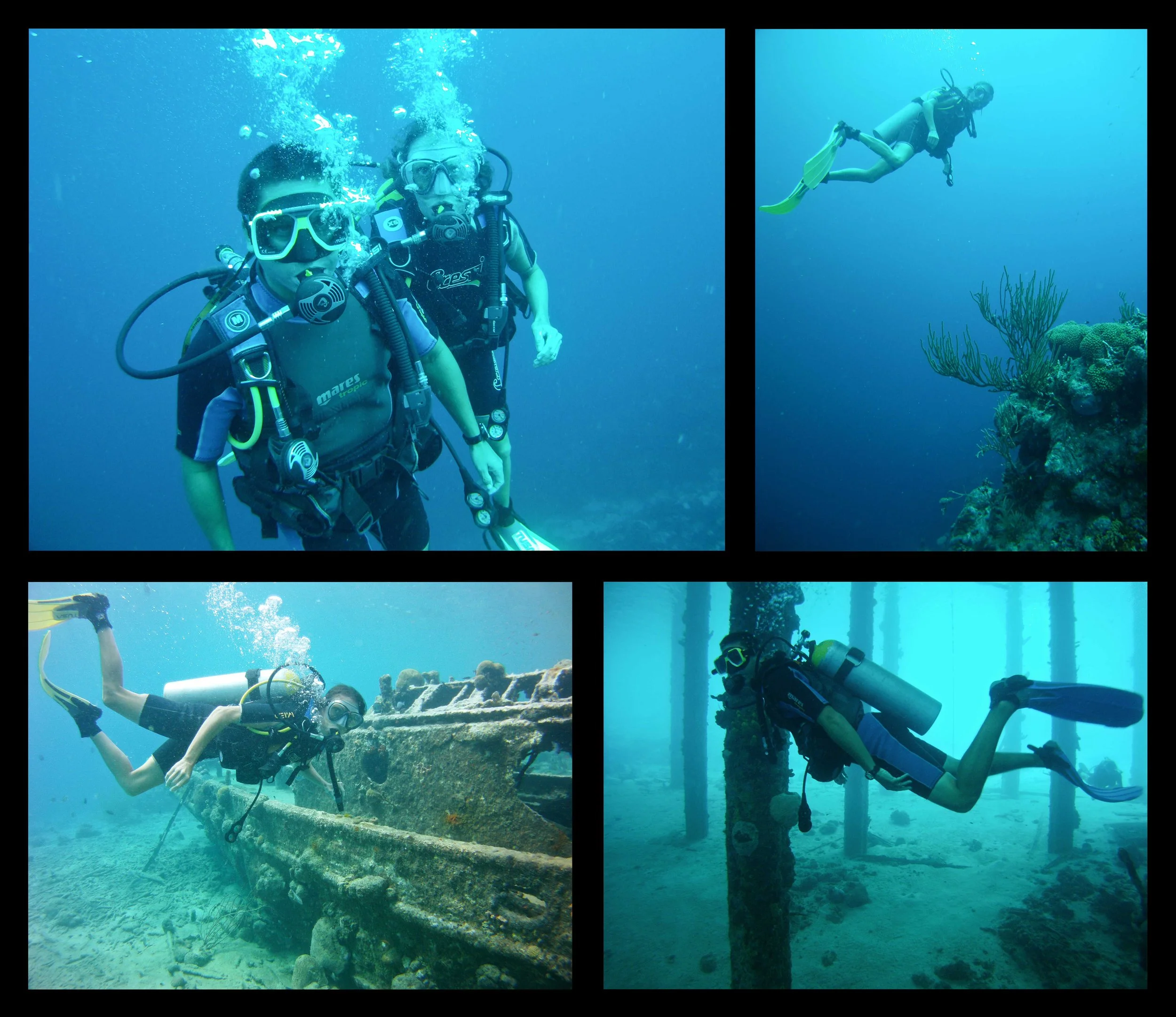 We did a drift dive, letting the current take us north along the beautiful coral wall. After about thirty minutes we reached a small tugboat, which had sunk in about 20 feet of water and has been overtaken by coral and fish. The last stop was under a pier where a large ferry has been docked for years, and many kinds of sponges and other coral thrive in the low light environment. Not one of the most spectacular sites and there weren’t many fish, but it was nice to be diving again.