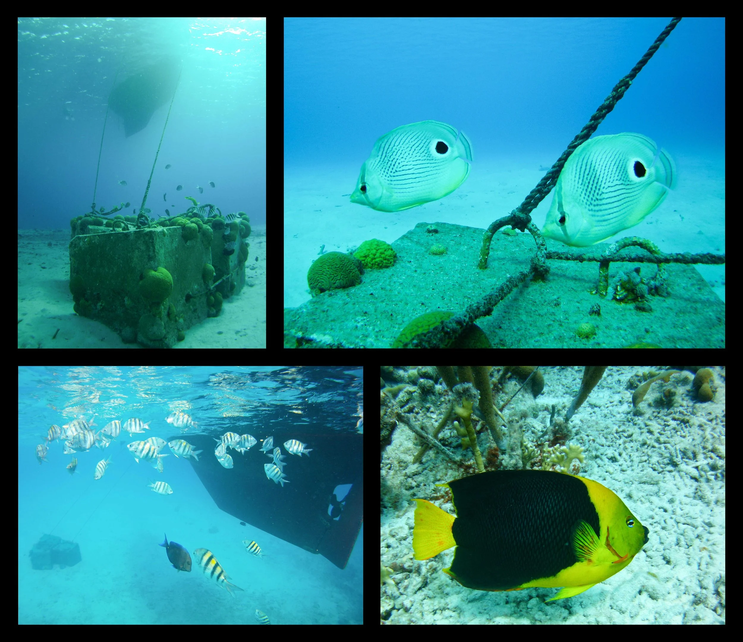 The water was incredibly clear, and we were pleasantly surprised to find what appeared to be a very good mooring system. There were three two-ton concrete blocks held together with steel cables, and two independent nylon lines connected to them. The concrete blocks sit near the edge of a shallow shelf that stretches 50 yards from the island and then drops off abruptly. When we were swinging on the mooring, our bow was over water 20 feet deep and the stern was over water 50 to 80 feet deep. This steep wall was a haven for fish, and it was all right under the boat.