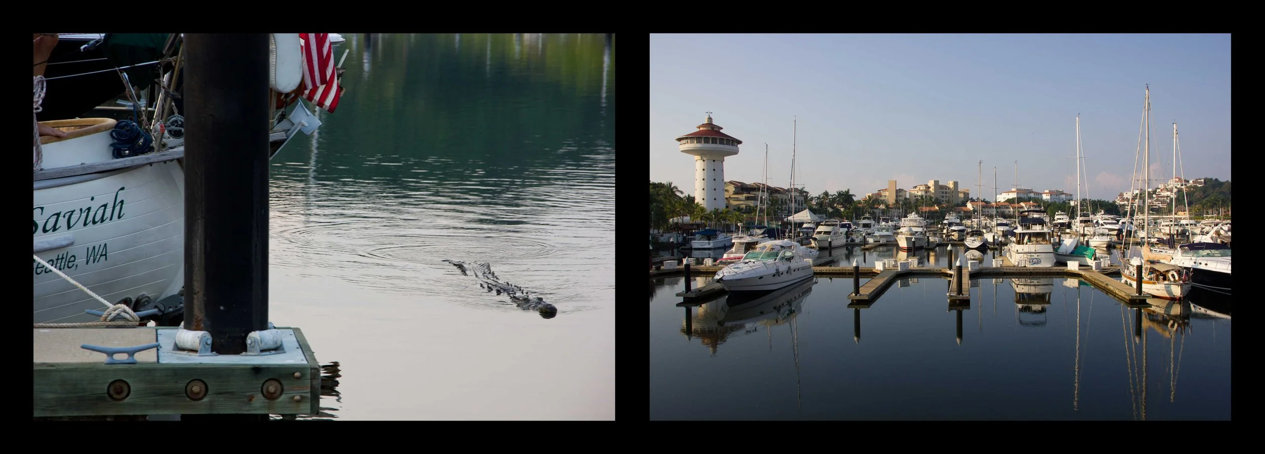 Marina Ixtapa, crocodile swimming behind Saviah