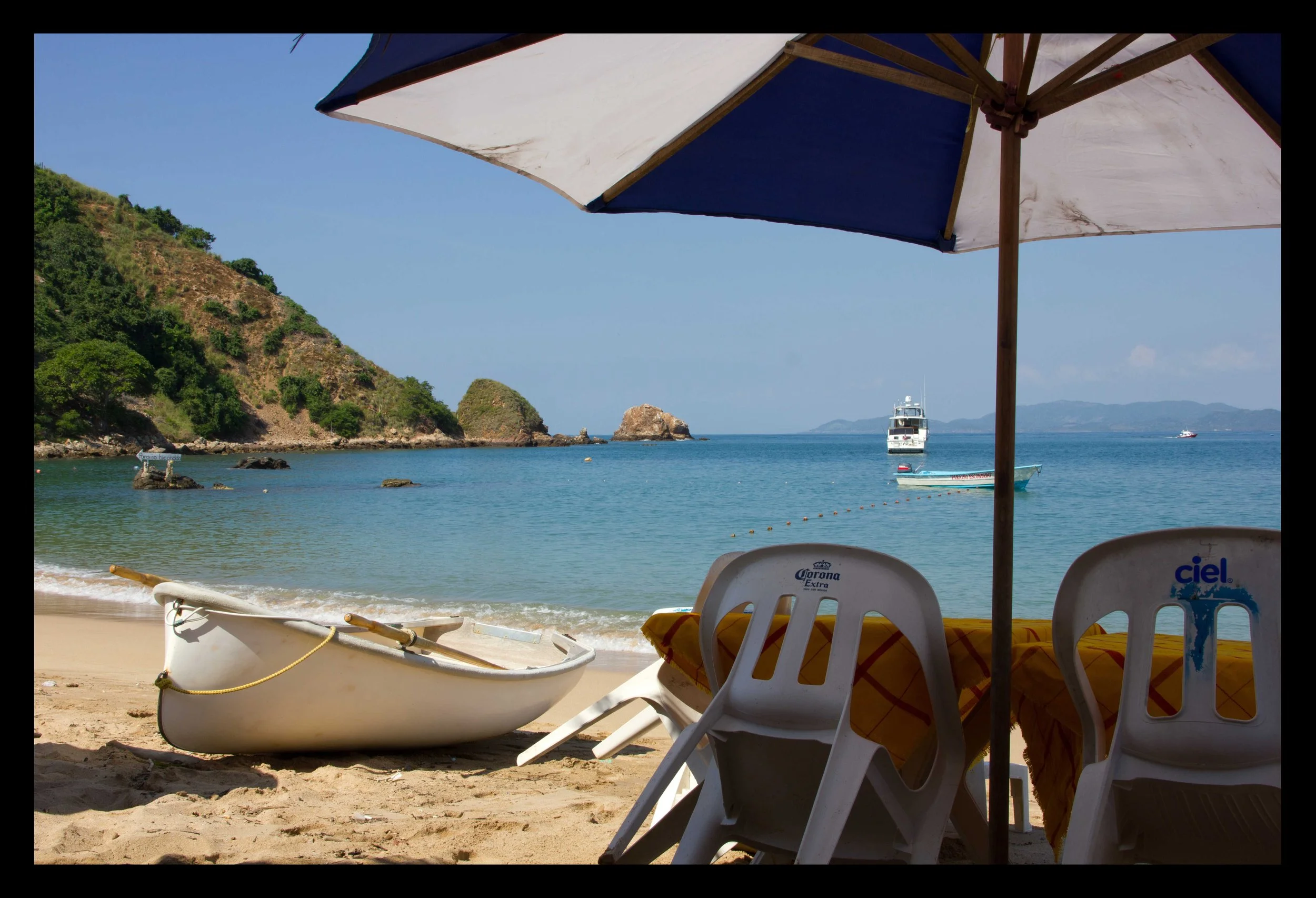 We didn’t care much for Ixtapa, which was just rows of hotels and shopping centers, but it was a nice place to do some cleaning and small maintenance jobs. After several days, it was time for a change of scenery, which we found at Isla Grande, just a few miles offshore. We motored around to the north side of the island and dropped the hook. It was clear water and a sand bottom, so we went for a quick swim and did some cleaning on the hull and the prop, which was past due. Then we rowed to shore for some lunch before heading back to the marina that afternoon.