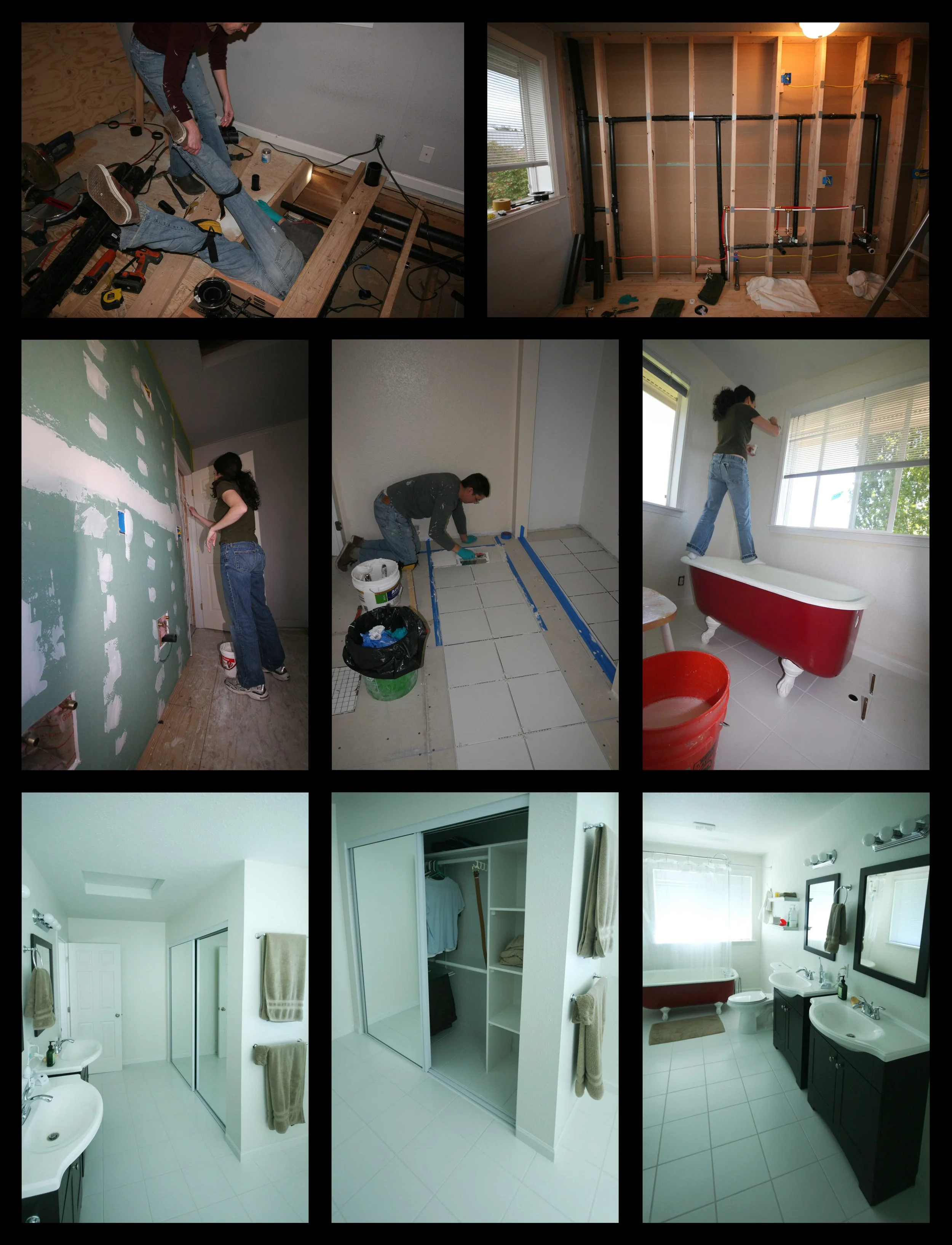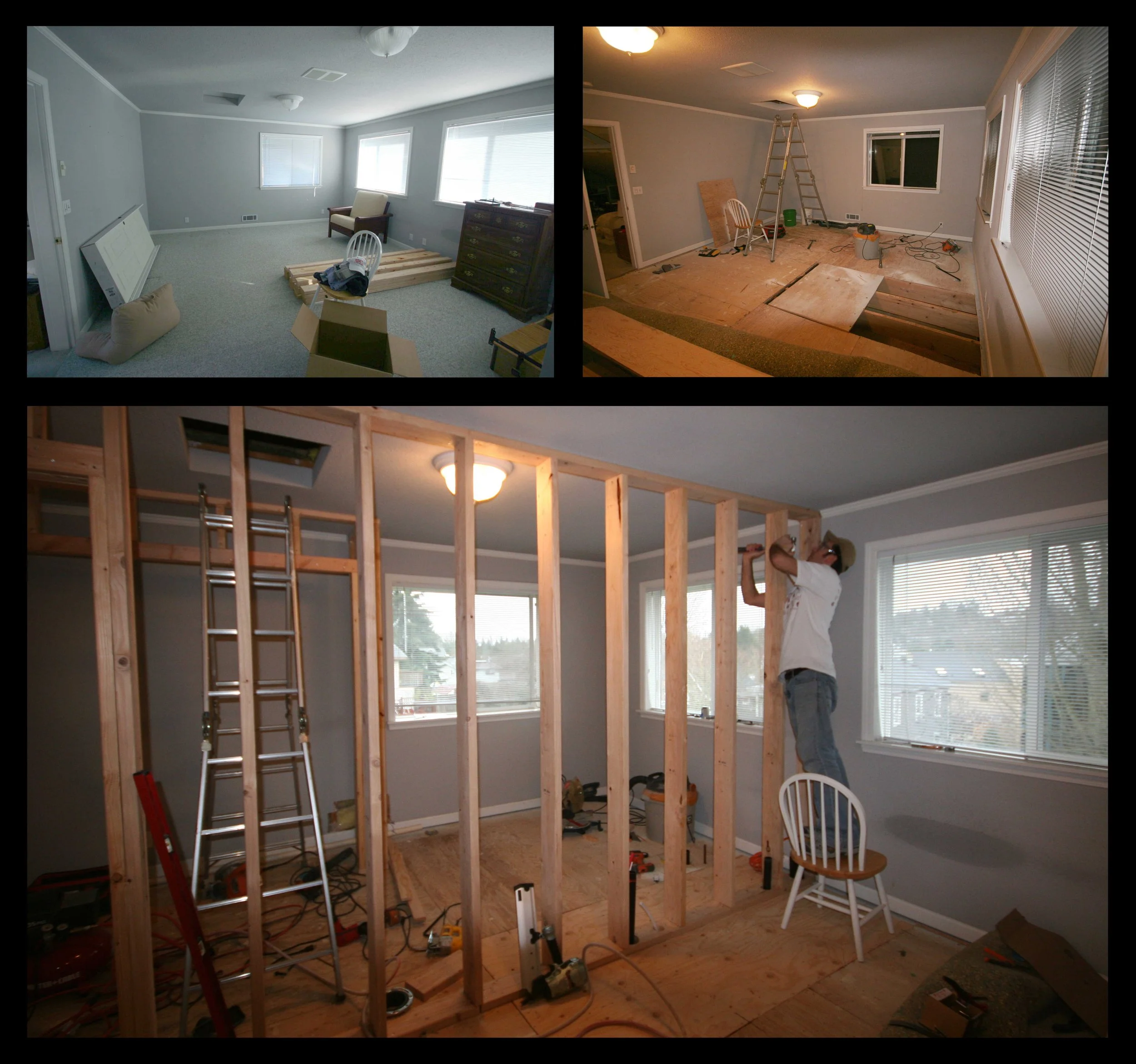 The next project involved adding a master bathroom. There were two bathrooms in the house, but both were downstairs, and we had a large bedroom upstairs with plenty of extra space to section it off and add a master bath. We took up the carpet and removed the subfloor to allow us to run plumbing upstairs, and then we framed up a wall.