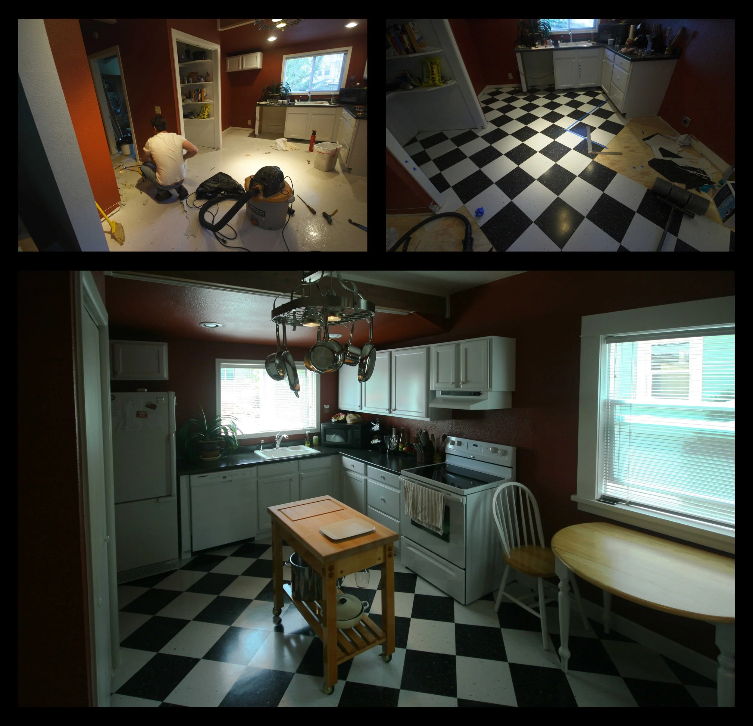 In the kitchen, we replaced the countertops, put some new shelves in the pantry, painted the cabinets, added new appliances and installed new flooring.