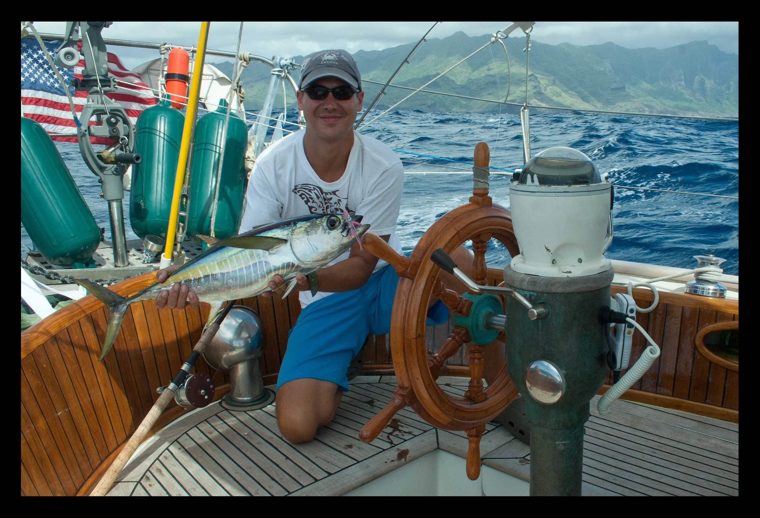 The next morning we rounded the southeast corner of the island and headed north to Baie D’Anaho. This anchorage was reported to have the best protection of any in the Marqueasas on top of beautiful white sand beaches, so we were anxious to check it out. Sailing conditions were good, setting us on a beam to broad reach in 10-15 knot E to ESE winds. On the way, Andrew caught a yellowfin tuna. We had done almost no fishing since arriving in the Marquesas, so the fresh fish was a welcome treat. This was also our first yellowfin tuna and was definitely the best-tasting fish we have had so far. Andrew filleted the fish before we entered the bay so as not to attract sharks in the anchorage where people were bound to be snorkeling. It was too big for us to eat in one day, so we ended up giving quite a bit away to a French cruising couple in the anchorage.