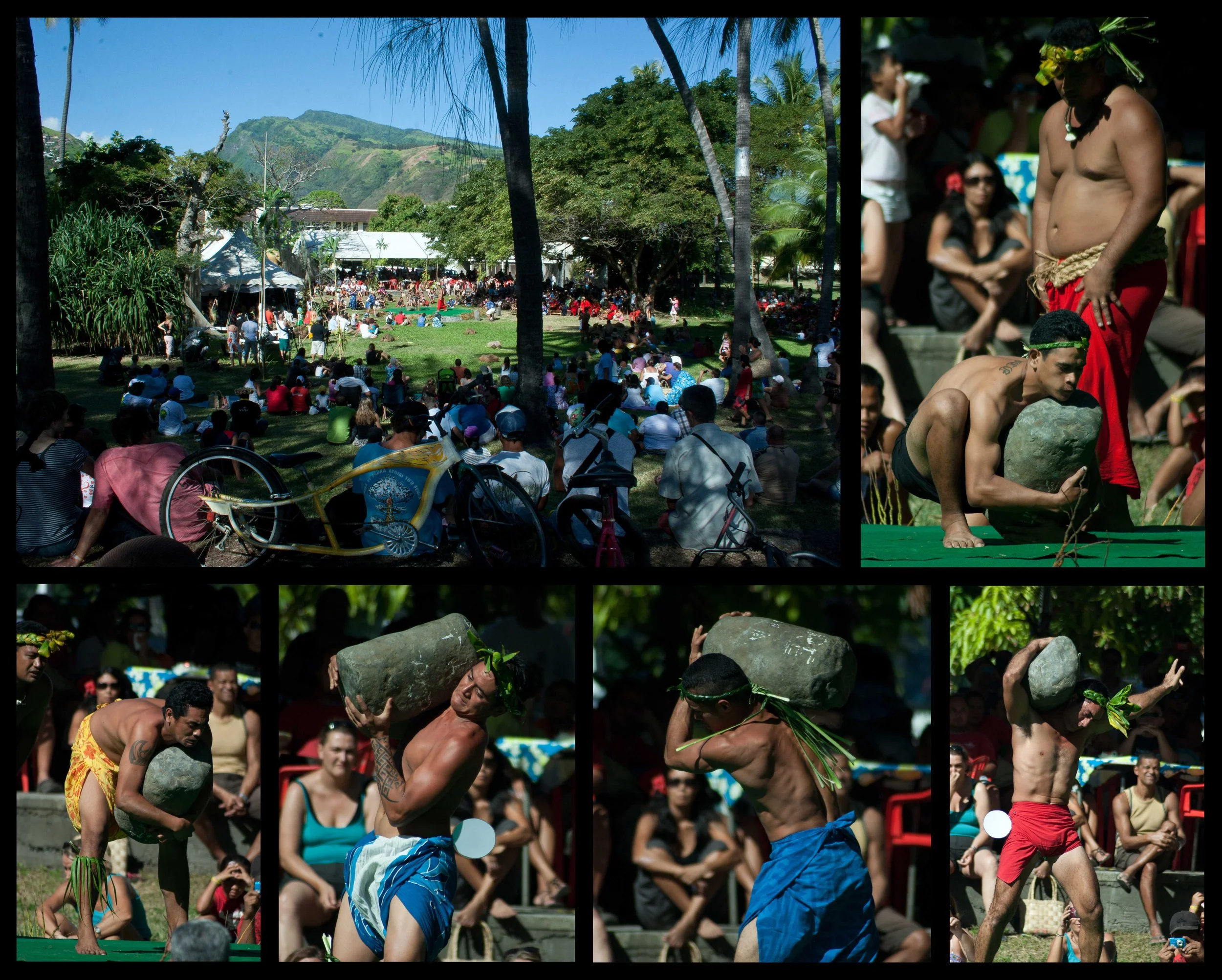 They also had traditional games at the Musee de Tahiti et des Iles. We spent a couple days at the museum watching these competitions. The first one was ramassage de cocos, or as we called it, the coconut toss. Each contestant stood about 60 ft from a barrel and they would try to fling coconuts into the barrel. There were two methods they used for tossing the coconuts. Some competitors used two short sticks for the underhand toss: one stick with a metal spear used to pick up the coconut and fling it, and the other stick used to hit the spear, causing the coconut to come off and fly through the air. If you don’t whack the spear, the coconut stays on through the follow through and launches backwards into the crowd – it happened a couple times. Another method was to use one long stick with a spear on the end, tossing the coconut overhand. The competition was pretty casual. The participants would joke around with each other, and every so often the tossing would have to stop when a kid ran out onto the field.