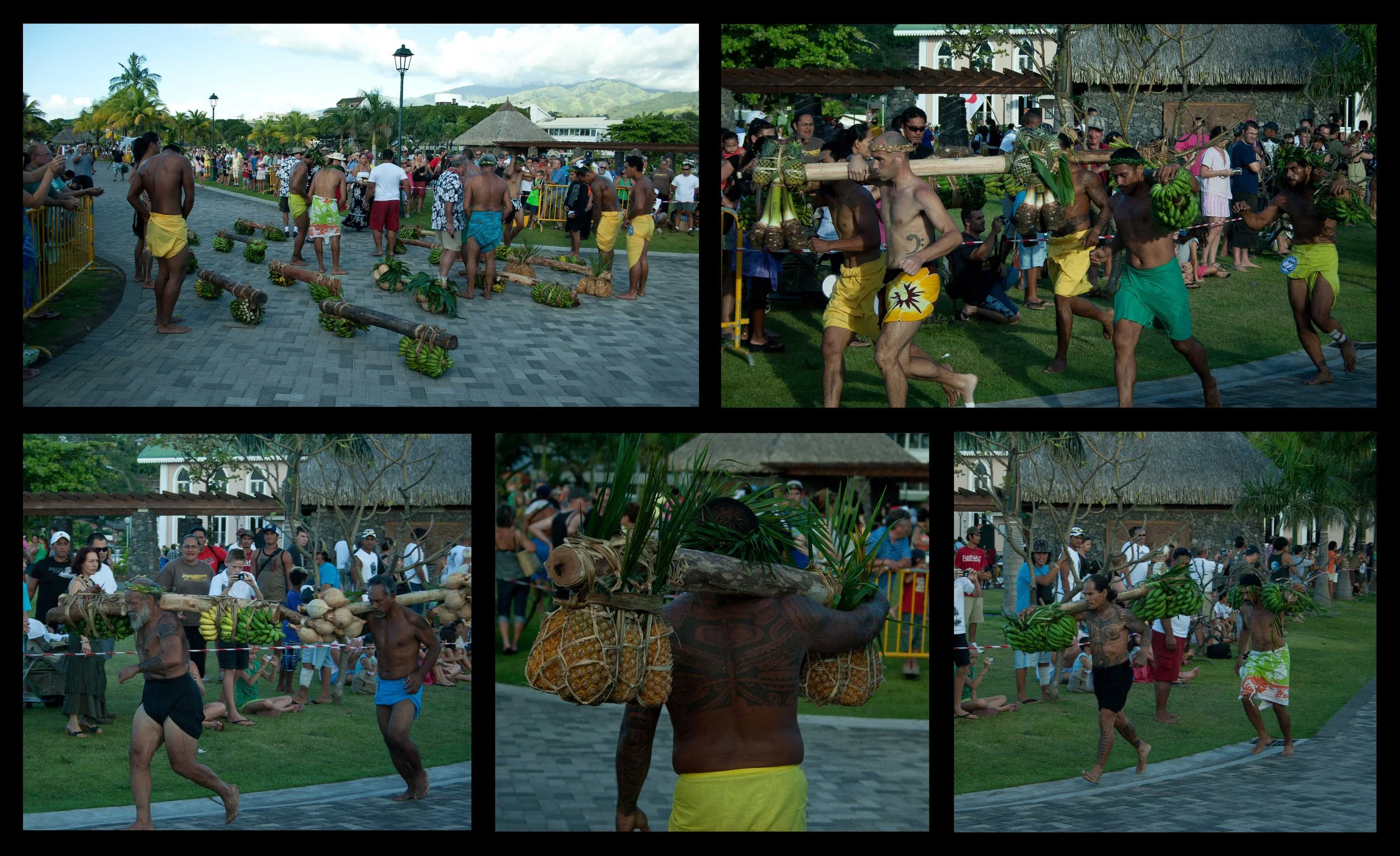 One of the competitions we attended was the fruit-carrying race at the Paofai Gardens on the Papeete waterfront. We had a great time watching this unusual race. Each competitor had a four foot long log with various fruits tied to each end. There were mostly bunches of bananas, although some people used taro root, pineapple and coconuts as well. There were a few different classes of races including women’s, an over-forty age group, and “champions”. They carried weights of 33 lbs, 44 lbs and 110 lbs, respectively.